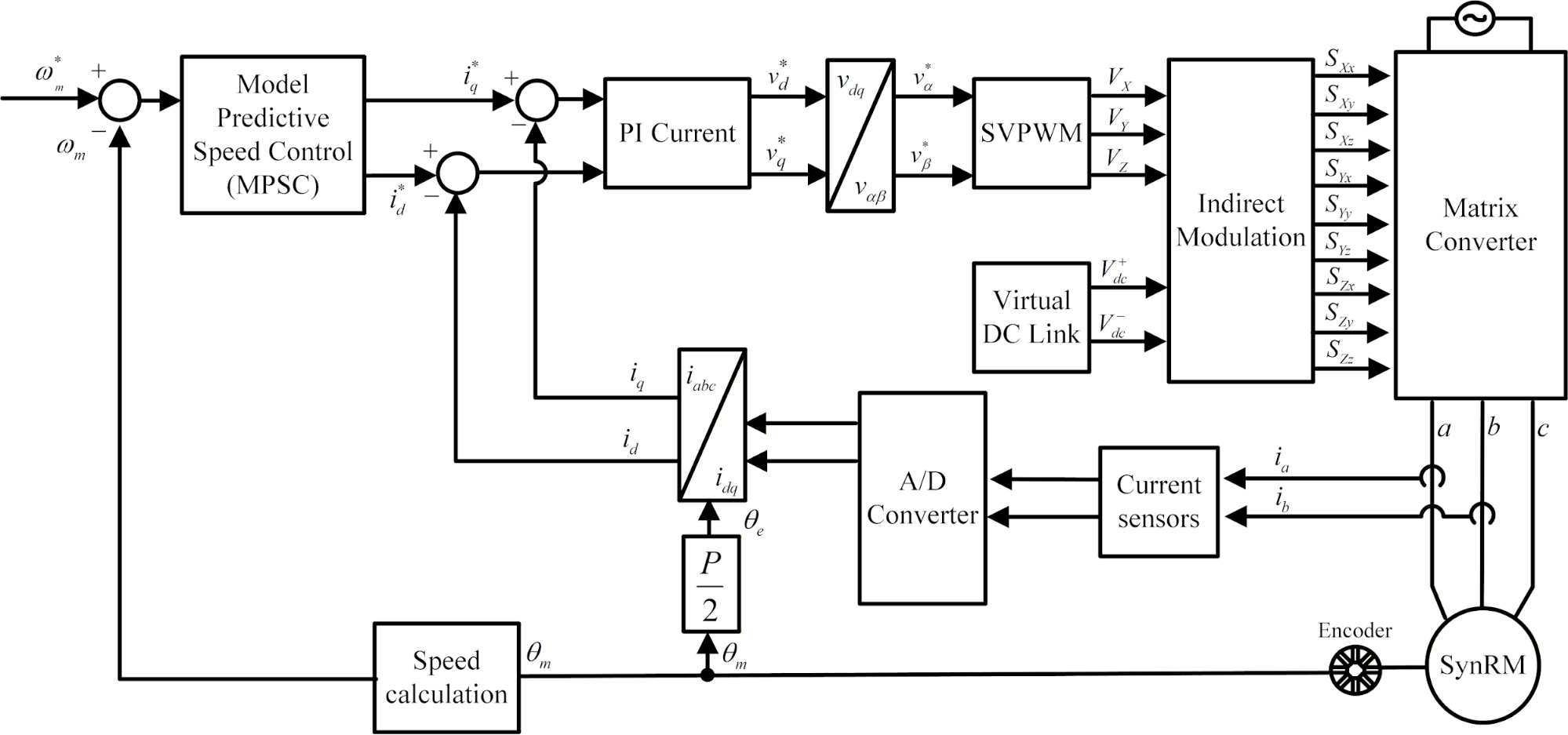 In this paper, the SynRM indirect matrix converter drive system uses model predictive speed controller (MPSC) and proportional-integral (PI) current controller based on the mechanical model of motor. A comprehensive block diagram of the overall drive system configuration is presented in Figure 1. The proposed speed drive system is based on an indirect matrix converter topology and incorporates several key components, including MPSC and PI current controllers, a modulation algorithm, the matrix converter unit, and a SynRM as the load. The detailed matrix converter and the controllers design are explained in the following subsection.