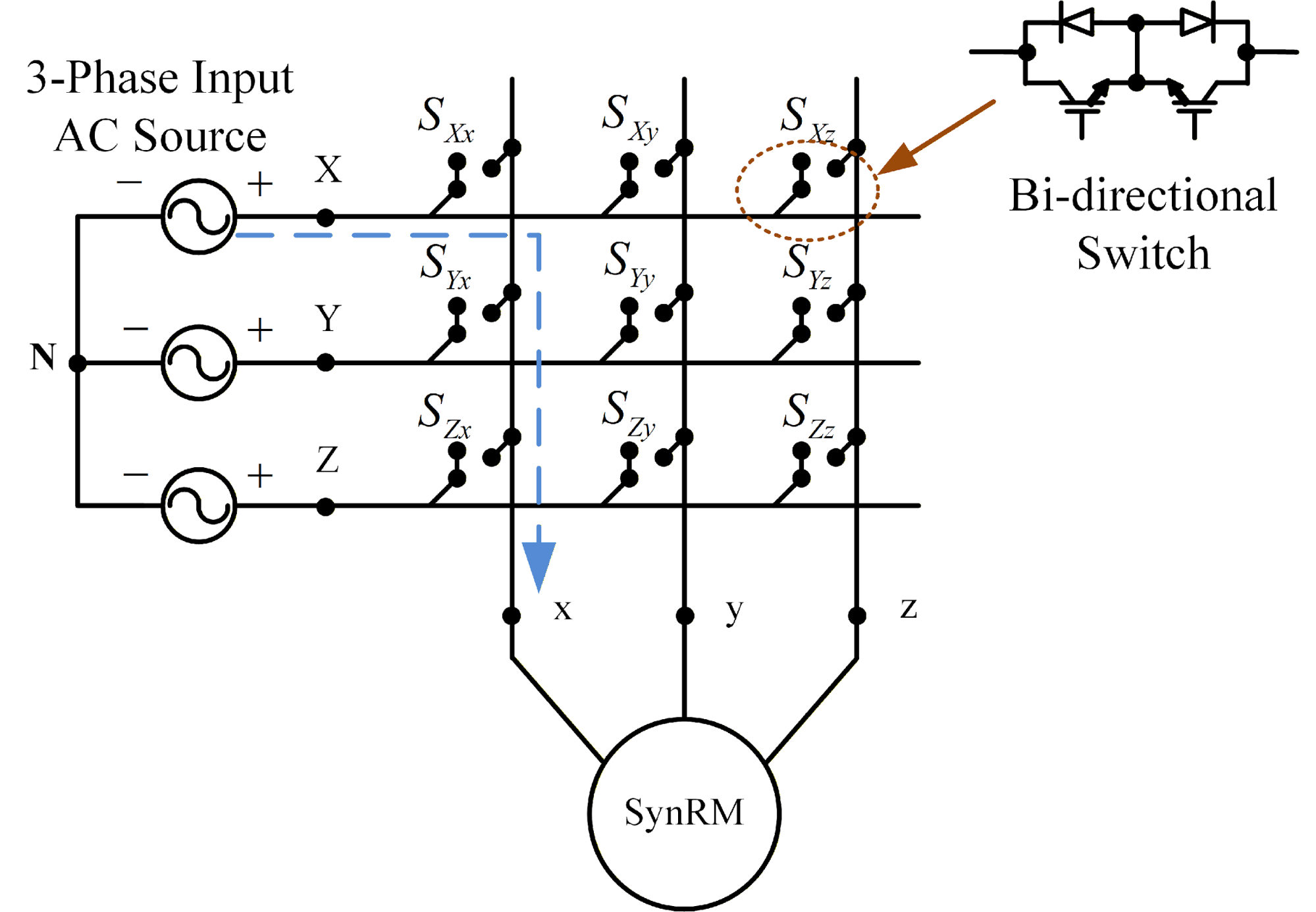 One of the common applications of matrix converters is in driving synchronous motors, specifically permanent magnet synchronous motors which have numerous benefits, including high power density and efficiency [31]-[35]. To achieve the best performance, matrix converters need advanced control schemes that can handle their complex switching behaviours and ensure stable operation of the synchronous motor. AC motors, including both induction and synchronous types, are essential in many industrial applications, including electric vehicles and robotics [36]. Combining matrix converters with synchronous motors creates a powerful synergy, resulting in drive systems with exceptional performance and energy efficiency [37]. In recent years, notable progress has been made in refining both the control strategies and design topologies of matrix converters used in synchronous motor drive applications. The matrix converter consists of actively controlled semiconductor devices and operates without the use of significant passive components. The minimization of passive components allows the matrix converter a topology primarily reliant on power semiconductor devices. Consequently, it offers exceptionally high power density, making it particularly well-suited for size and weight-sensitive applications such as aerospace, military systems, electric traction, and power distribution. The primary function of a matrix converter is to convert one AC voltage system to another, accommodating arbitrary amplitude, frequency, and number of phases [38]. To ensure bidirectional operation, matrix converters are built using bidirectional power semiconductor switches. However, the absence of magnets also makes synchronous reluctance motors a cost-effective alternative than permanent magnet synchronous machines [39].