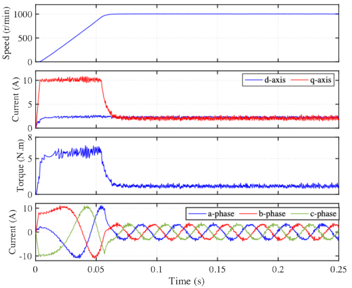 Figure 6 illustrates the transient responses of the SynRM speed drive system during acceleration from a low-speed range to the rated speed using step change input. Specifically, from 200 r/min to 1800 r/min, covering a wide operational range representative of typical industrial requirements. As evident from the simulation results, the proposed drive system exhibits satisfactory dynamic performance across the entire adjustable speed range. The motor speed closely follows the reference trajectory with minimal overshoot and rapid acceleration. The settling time is directly proportional to the magnitude of the speed command. As the speed command increases, the settling time becomes longer. At a low speed of 200 r/min, the settling time is approximately 0.02 s, whereas at the rated speed of 1800 r/min, the settling time increases to 0.7 s. Therefore, the overall settling time ranges from 0.02s to 0.7s, which can still be classified as a fast-settling response within the considered operating range.