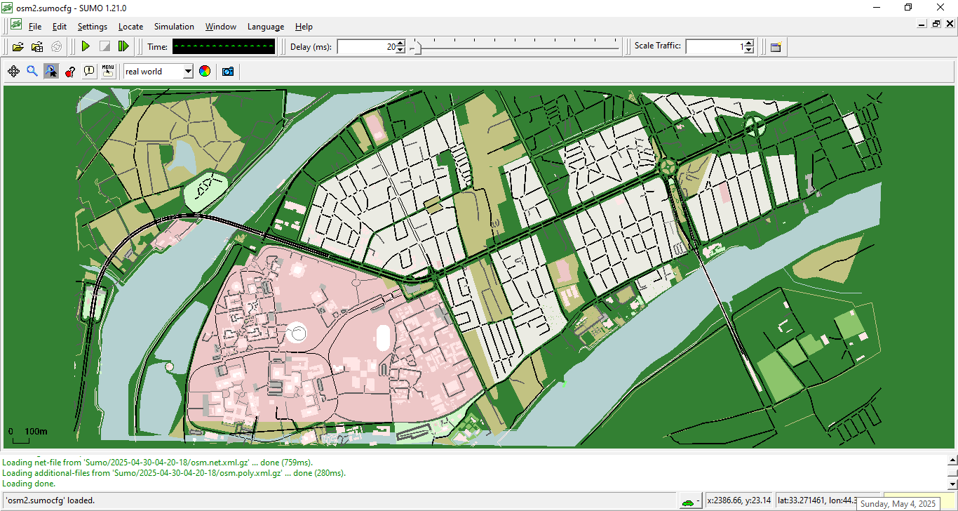 In this section, the simulation tools and environments employed are presented. The SUMO simulator is utilized to simulate connected vehicle environments and cover a variety of parameters and features, as shown in Figure 4. We have chosen to use the Python-based network simulator to perform simulations. It is a simulator for students and researchers in the field of vehicular communication networks, enabling them to implement their own settings and environmental conditions. The paper is a source code that is based on Python, and it provides guidelines for other researchers to modify or create new scenarios. It is composed of a large set of elements that comprise the simulator, such as Mobility Trace, Field, Vehicle, and Applications.