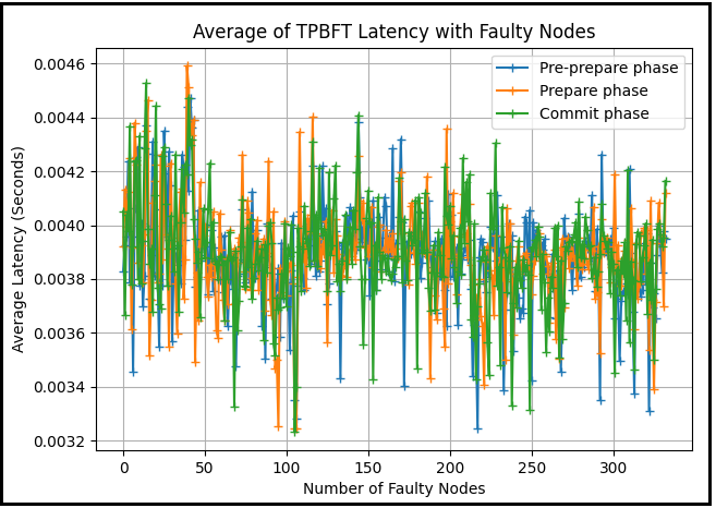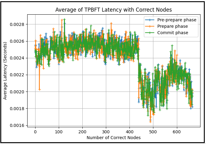 Figure 8 represents the average latency of TPBFT phases in VANET, which contains 333 faulty vehicle nodes from 1000 vehicle nodes. The graph compares how latency varies during each phase with fluctuating numbers of correct nodes, illustrating that latency values generally range between 0.0032 and 0.0064 seconds. The network delay varied according to the structure of the network; the delay in approving transactions was directly influenced by the number of nodes in the transportation network. With the quantification of computing blocks per network context in VANETs, this study collates barriers that were focused only on hardware applications used for attack mitigation in the VANET, ensuring the trust of the blockchain.