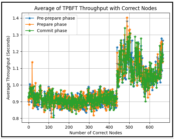 In the following graphs, we summarize the effect of adopting TPBFT on the latency. To get a visualized and rough understanding of the performance gap, we present the data of an empty blockchain in our graphs. To have an in-depth investigation of the LTP between different blockchains under different settings, we randomly take 1000 generated nodes from the two selected blockchains and compute the median; the median is the point in the distribution of the blocks. The parent of a randomly generated block and its presentation time will effectively decrease the computational cost. Also, the bottleneck is how to get the mean and variance of the block interval and sustain the high performance of the realization. Figure 9 represents the average throughput of TPBFT phases in VANET, which contains 667 correct vehicle nodes from 1000 vehicle nodes. The graph compares how throughput varies during each phase with fluctuating numbers of correct nodes, illustrating that throughput values generally range between 0.8 and 1.4 seconds, with some spikes and dips throughout.