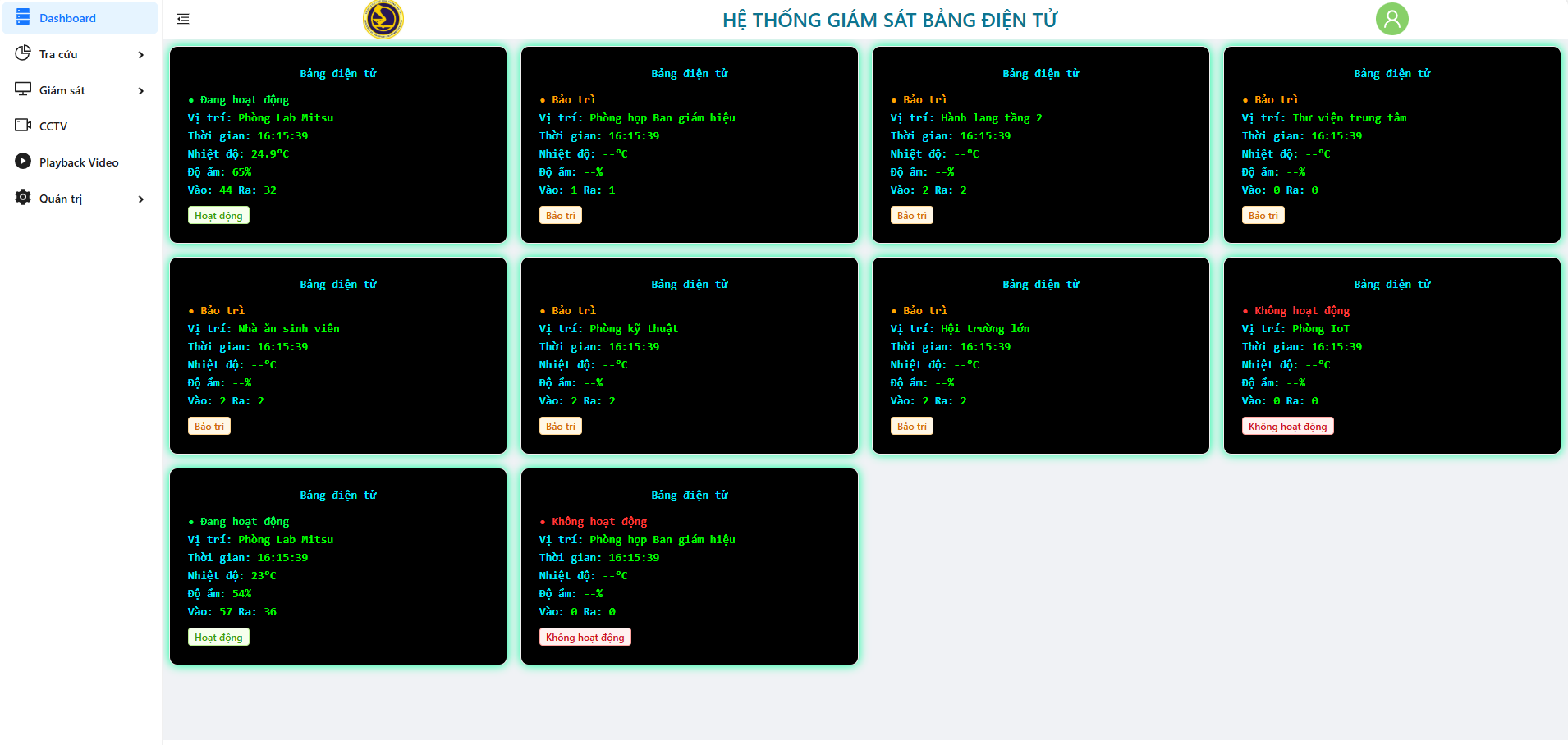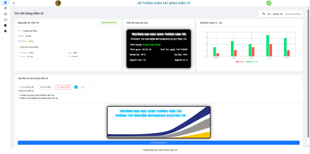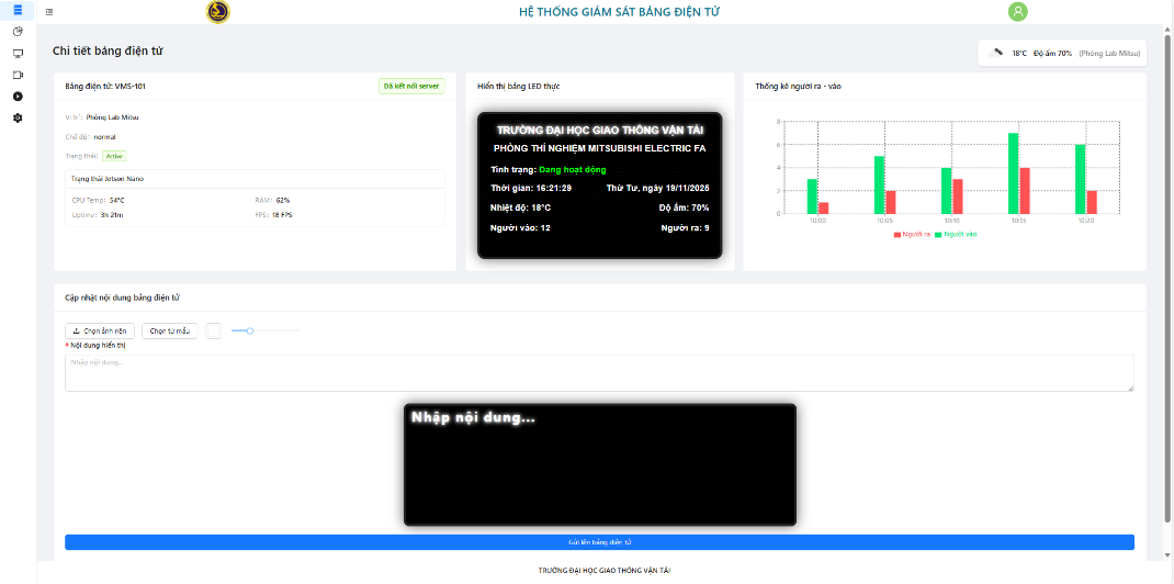 The web interface layout is organized in an intuitive grid format, clearly separating the status monitoring area, the LED content preview area, and the control configuration block. This allows operators to quickly grasp important information and perform operations with minimal steps. This layout effectively supports real-time management and reduces errors during display configuration. The web interface windows display the status of each board: active (green), maintenance (yellow), and inactive (red). Each tag provides location, system time, temperature/humidity, and real-time In/Out people counters. All data tags are updated via MQTT/WebSocket on the web interface, assisting managers in effectively operating and monitoring the system can be seen in Figure 18. The left-side functional group displays Jetson nano status (CPU temp, RAM, uptime, FPS); the middle functional group is the P2.5 LED board preview (512×128 px) simulating actual content; the right-side functional group shows the graph of people entering/exiting per minute; and the bottom functional group is the configuration form for content (text/image/effects) and font size settings.
