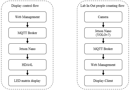 The separation of the LED display control flow and the laboratory In-Out people counting flow is achieved by splitting them into two subroutines within two apps files, which are then installed on a custom-configured Jesson nano. This allows heavy AI inference tasks to run independently of real-time display tasks, thereby avoiding resource contention, reducing latency, and preventing display errors that could affect counting accuracy. This architecture helps the system maintain stable performance and high reliability even under high display load or traffic, while also increasing system scalability and maintainability can be seen in Figure 2.