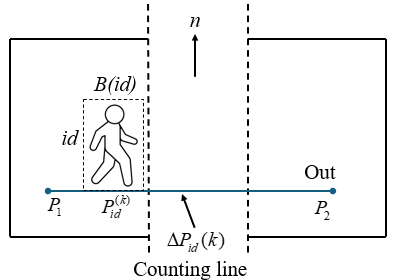 In the image coordinate system, a counting line is established parallel to the laboratory door threshold. For each tracked human target with a specific ID, the representative point is defined as the "foot" of the bounding box (the coordinates of the midpoint of the bottom edge) at time step k denoted as