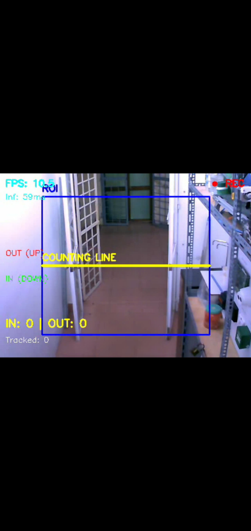 The testing of the proposed algorithm for counting the number of people entering and exiting the laboratory was conducted on Jetson nano hardware, utilizing real-world data collected from the Logitech C505eHD camera installed at the laboratory entrance. The testing process for the people counting algorithm was conducted under three different scenarios: Scenario 1: Normal In/out flow with normal lighting. Scenario 2: Crowded In/out flow with potential trajectory intersections and normal lighting. Scenario 3: Normal In/out flow with variable lighting conditions. Initialization of the ROI (blue color) and counting line (yellow color) is aligned with the door position; the displayed FPS ranges from ~10.5 to 10.9, with an inference time (Inf) of ~59 ms per inference (using the TensorRT engine) can be seen in Figure 14.