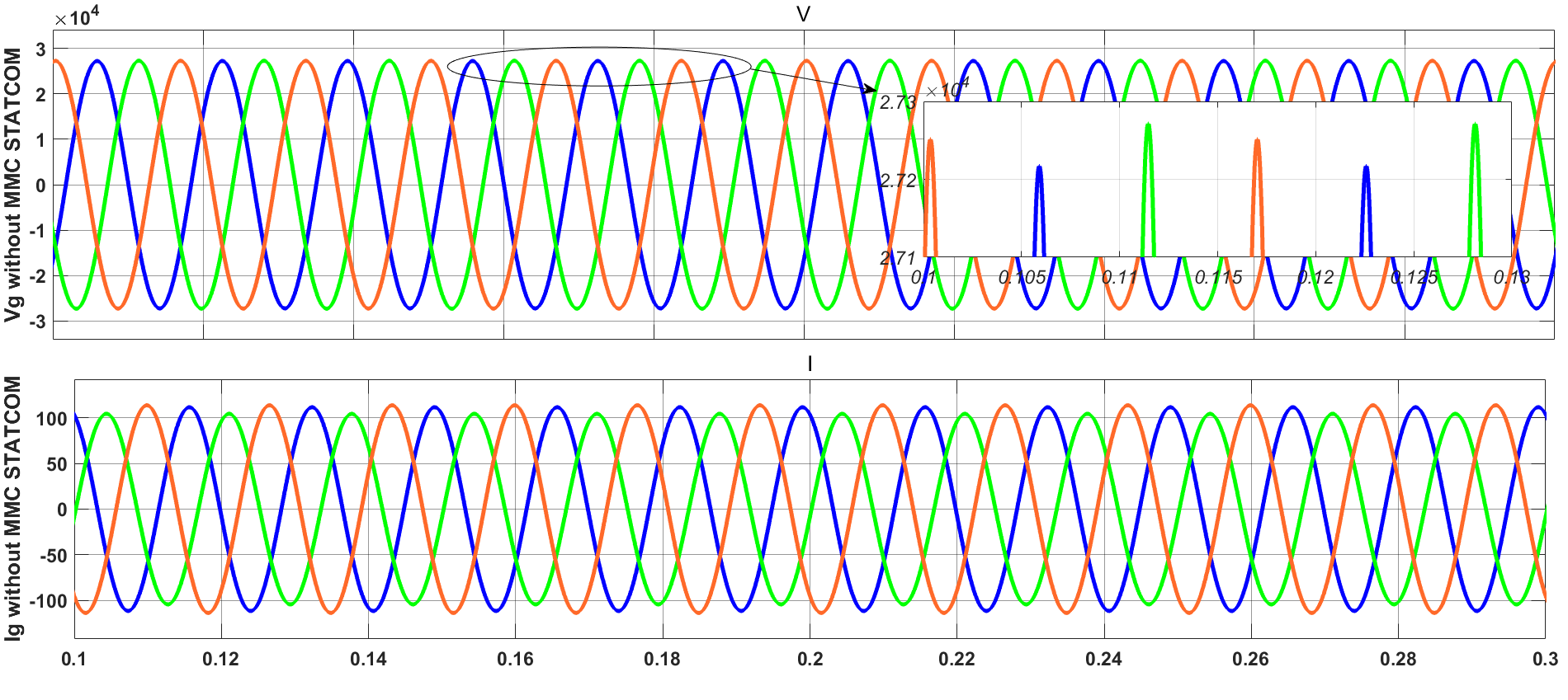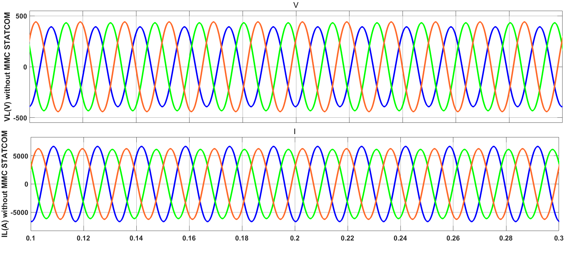 In this scenario, a severe unbalanced condition was created by adding an approximately 25% inductive load to phase A. The unbalance voltage and current at load side are illustrated in Figure 21. The unbalance voltage and current at grid side without MMC-STATCOM are displayed in Figure 22. The effectiveness of the grey-PID controller is demonstrated as it successfully restores the balance to the grid voltage and current. This regulation entailed a rise in the grid current, driven by the injection of the necessary reactive current component as shown in Figure 23.