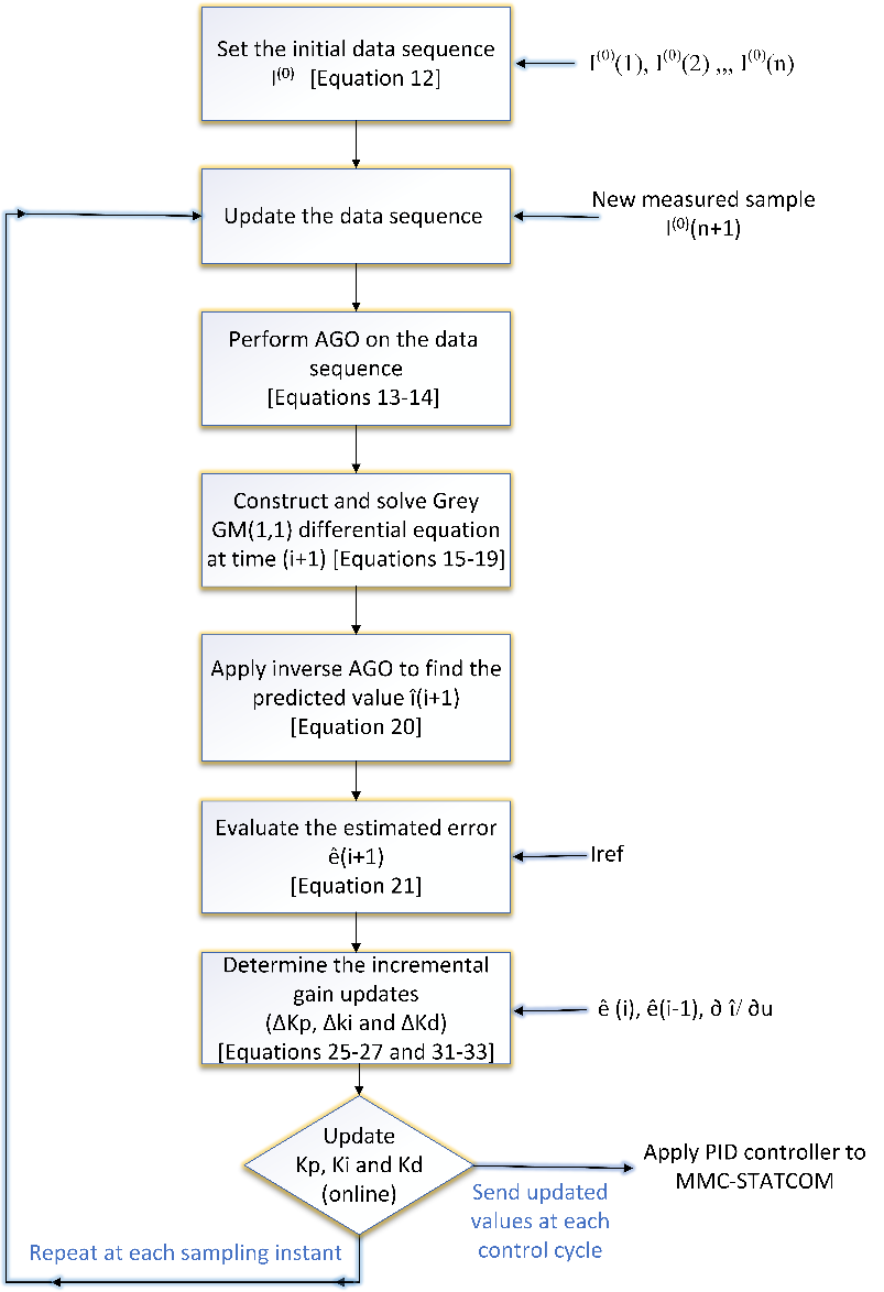 Although PI or PID controllers are widely used in MMC-STATCOM systems, the adaptive controller offers faster response, especially under transient operating conditions. Typically, tuning of adaptive PID controller relies on the instantaneous measured values [36]. In the suggested technique, the predicted variable is implemented instead of the measured value. The predictor employed, in this study, is the Grey Model GM(1,1) which updates the PID gains using only a limited set of previous data. Owing to the simple mathematical structure of GM(1,1) model, the prediction process can be executed with minimal computational effort to provide accurate predictions [37]. Despite the additional prediction algorithm, the overall computational burden remains low, making the proposed method appropriate for real-time MMC-STATCOM control [37][38]. The concept behind this predictor is based on an operation named the accumulated generating operation (AGO) on data series to create a sequence. The sequence is then utilized to develop a difference equation. Least-squares algorithm is used to obtain the coefficients of the difference equation; The difference equation can then be solved. Based on this solution, one step ahead data is predicted using the Inverse accumulating generation operation (IAGO). Grey theory presents a family of grey models denoted as GM(m,N), where represents the order of the difference equation and