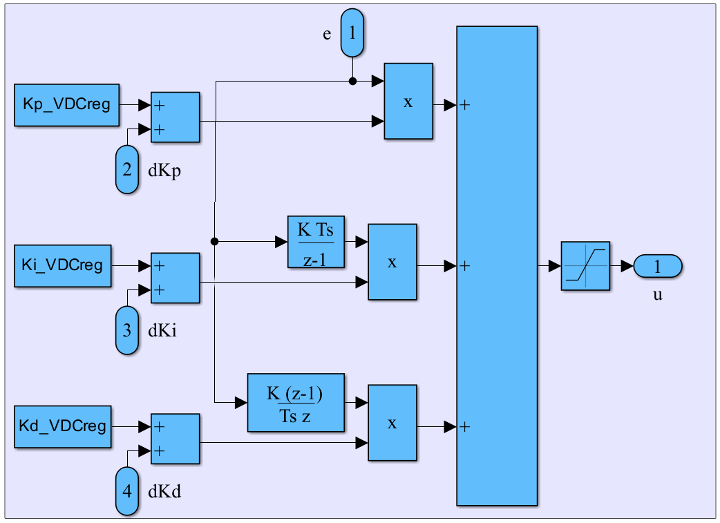 The phase-locked loop (PLL) is a precise estimator of the grid frequency and phase angle, ensuring that all control components such as the DC voltage regulator and current regulator operate within a synchronous reference frame aligned in both speed and phase with the grid. This synchronization facilitates decoupled control of active and reactive power and enhances the overall stability and dynamic performance of the controller, the PLL is shown in Figure 5. The DC-bus voltage regulator is shown in Figure 6, which employs an adaptive PID controller, the reference and measured DC voltages (,