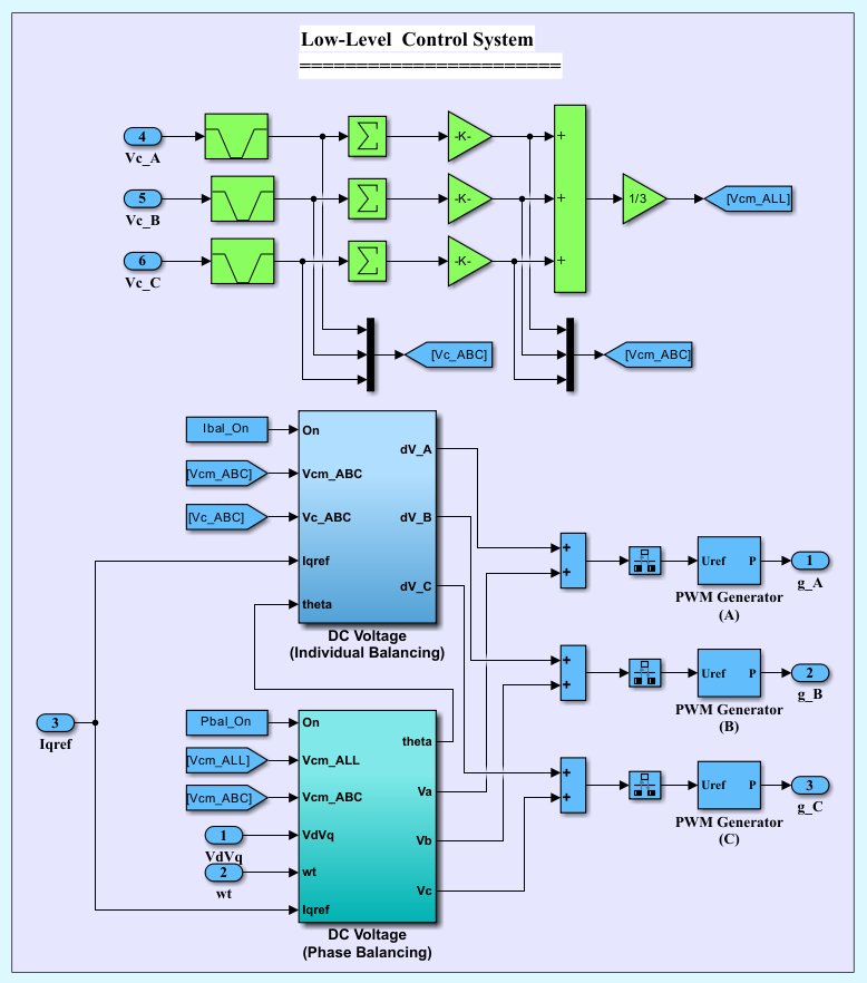 , the inputs of this unit are the present error and last two error signals, in addition to the estimated du/dy signal. The incremental updates are applied in real time to the PID gains, enabling the controller to maintain a fast transient response. Figure 11 and Figure 12 illustrate the gradient-descent unit and the adaptive PID, respectively. Low voltage side controller consists of phase balancing and individual balancing controllers of the DC bus voltage, that generate the appropriate gating signals for the converter switches [20]. Low voltage side controller is shown in Figure 13.