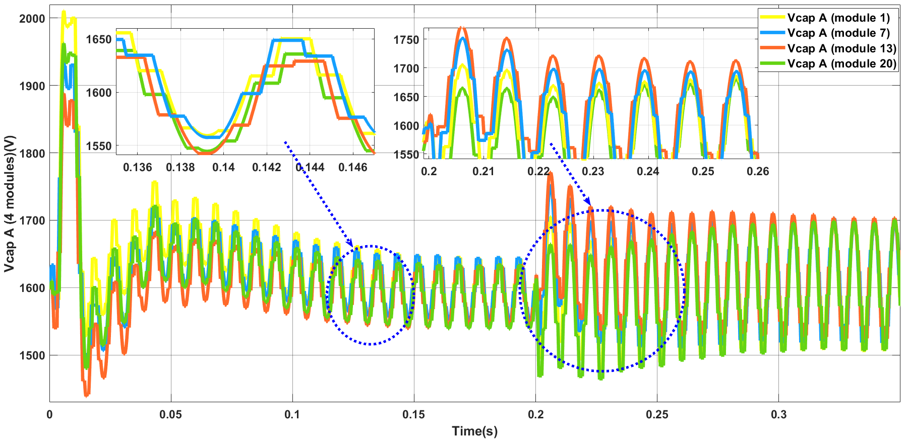 Figure 14. Response of phase-A capacitor voltages (sub-module 1, 7, 13 and 20) during transient condition