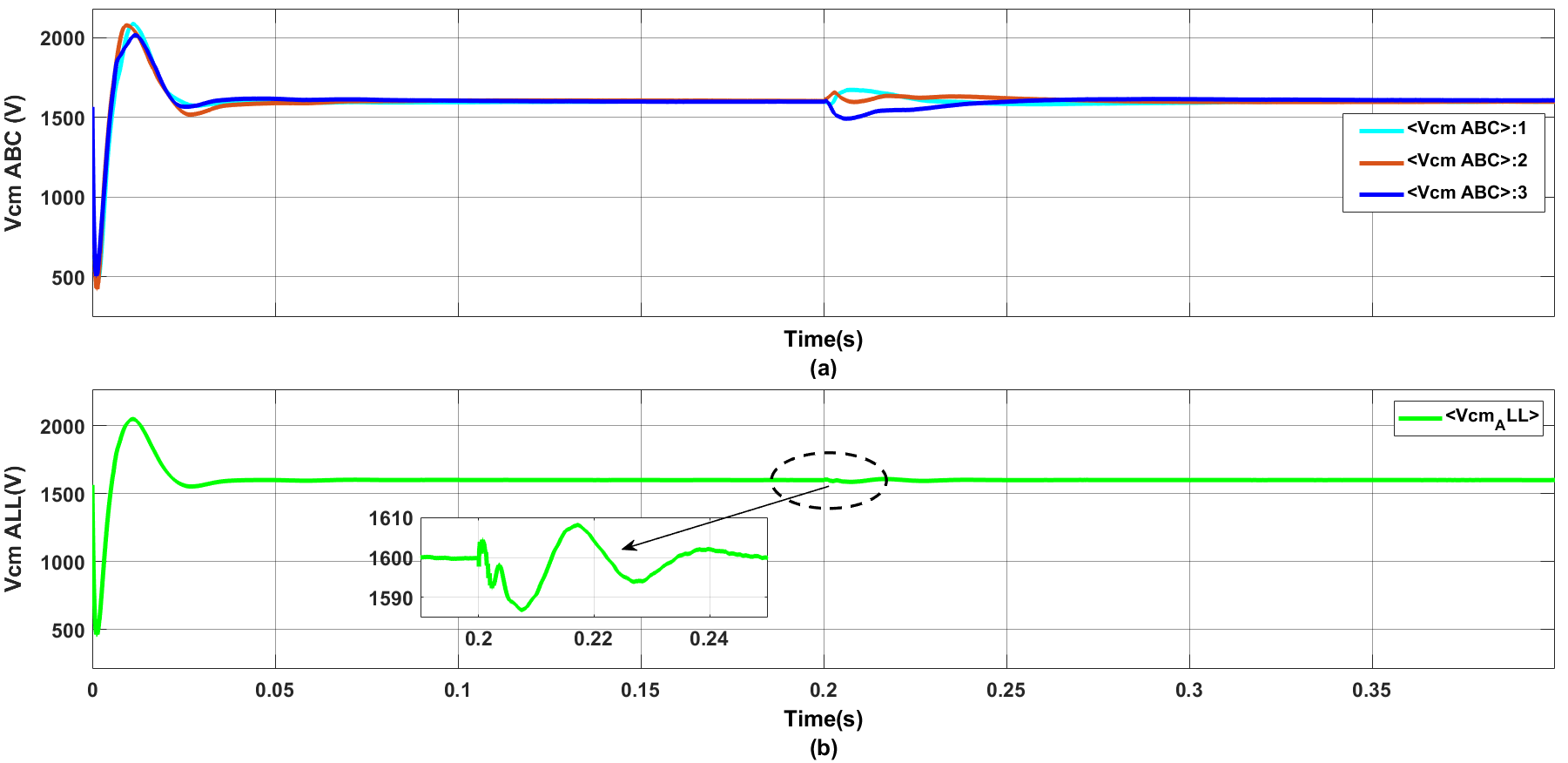 The dynamic behavior of the capacitor voltages for selected sub-modules in phase Ais illustrated in Figure 14. It can be observed that effective voltage balancing during transient operating conditions is maintained with minimal deviation. Figure 15 illustrates that the DC-link voltages return to their steady-state values within a short period after the change occurring at 0.2 s. According to Figure 15(b), the DC-link voltage exhibits a maximum overshoot of approximately 1.25% and settles time is within 0.04 s. Moreover, the steady-state error is negligible, confirming the effectiveness of the proposed control strategy in maintaining DC-link voltage stability which effectively minimizes the circulating current.