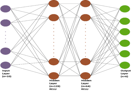 Used a deep Q-Network (DQN) with two hidden layers (128-64), fully connected, which allows the model to learn complex patterns. The Deep Q-Network (DQN) used has the following structure in Figure 1.