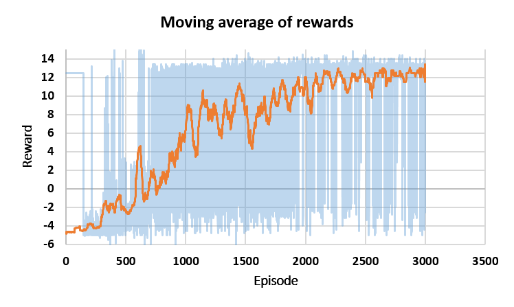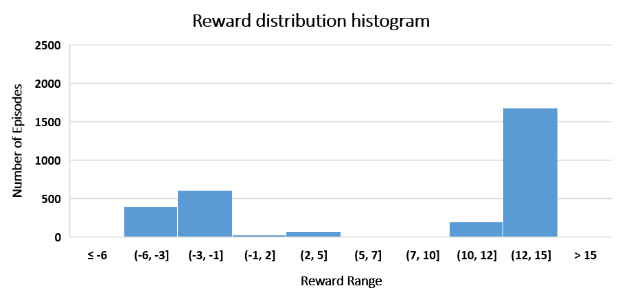 Figure 3. Reward evaluation during training, [a] Moving average of rewards, [b] Reward distribution histogram