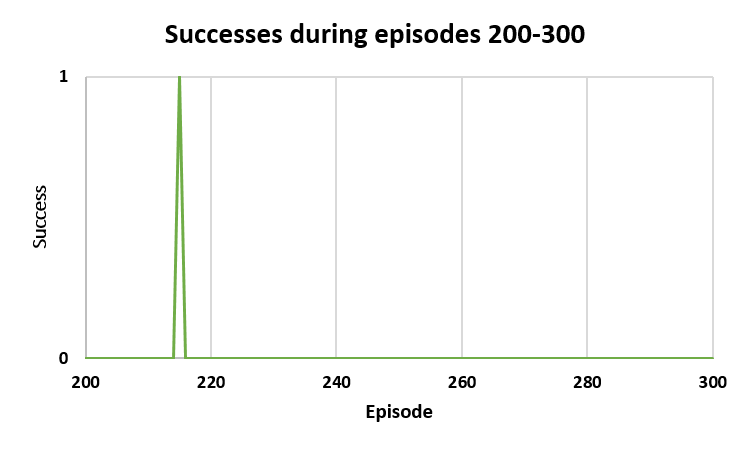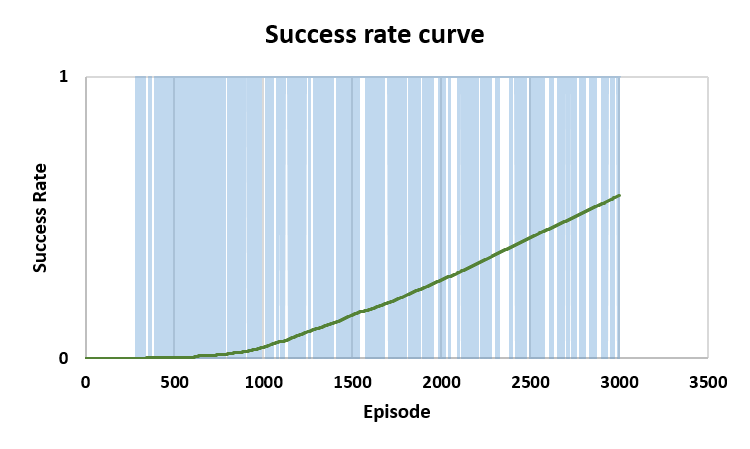 As illustrated in Figure 4, the increasing success rates during training are shown. Figure 4(a) and Figure 4(b) show that from episodes 200 to 300, the model achieved one success, while by the end of episodes 2900-3000, it had achieved 93 successes. Figure 4(c) represents the increasing success curve, while Figure 4(d) presents statistics on the number of successes and failures across 3000 training episodes, with green representing successes and red representing failures to achieve the goal.