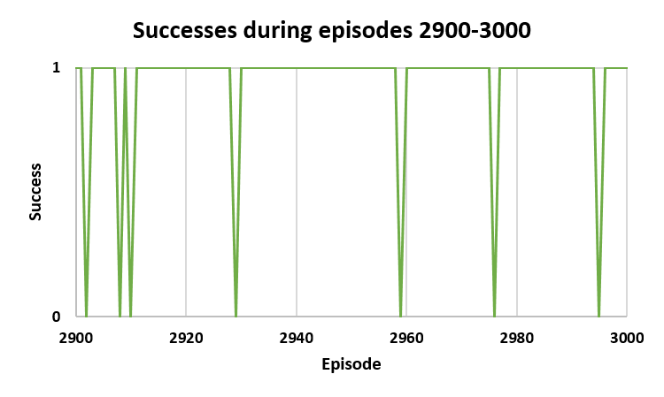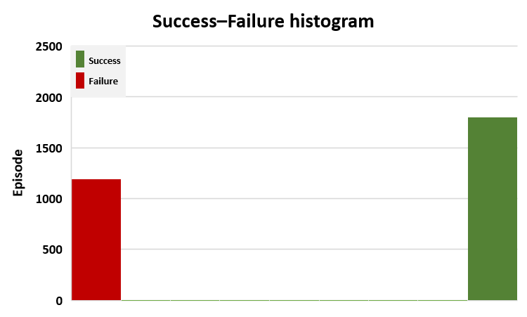 Figure 4. Analysis of agent success across training episodes: [a] Successes during episodes 200-300, [b] Successes during episodes 2900-3000, [c] Success rate curve, [d] Success–Failure histogram