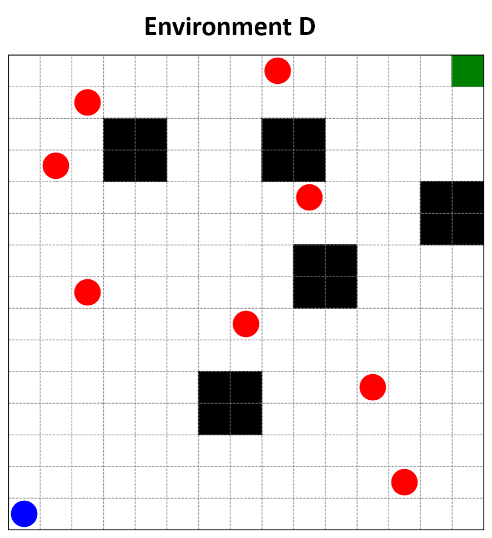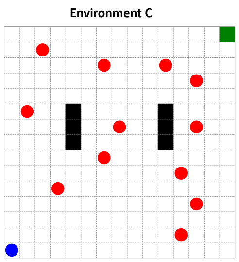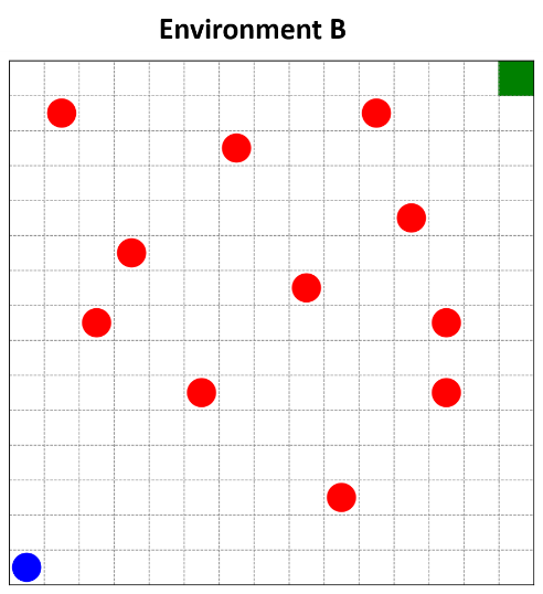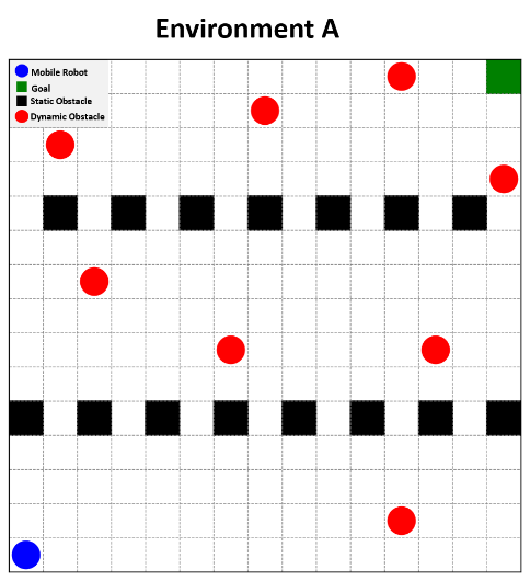 Illustrates Figure 5, the environments used for testing. The 15×15 grid environments are designed to evaluate the two models and compare the performance of each model in each environment, where each environment contains fixed and moving obstacles with different distributions and numbers for each environment. The speed of the obstacle is equal to the speed of the robot. The difficulty of each environment varies, with increasing density of obstacles and narrow passages. The blue circle represents the robot, the red circles represent moving obstacles, the black squares represent stationary obstacles, and the green square represents the goal.