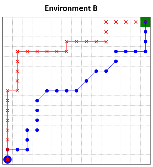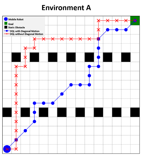 In general, the results demonstrates that diagonal motion tends to optimize pathfinding and stabilizes the tunings of the robot’s navigational behavior, particularly when encountering non-uniform obstacle distributions. While the performance is comparable between the two approaches, the number of steps difference increases by 10%∼20%, which implies that diagonal movement would be better in minimizing the steps regardless of the given environments. This further supports our claim that allowing diagonal moves is a useful extension for deep learning navigation algorithms, especially when they are used on physical robots, where how the energy and time it takes to reach the goal matter. Figure 6 illustrates the behavior of the algorithms in each environment. The blue path represents the DQL algorithm with diagonal movement, and the red path represents the DQL algorithm without diagonal movement.