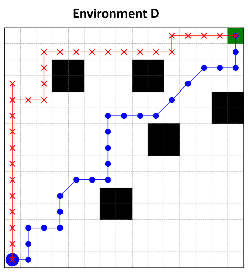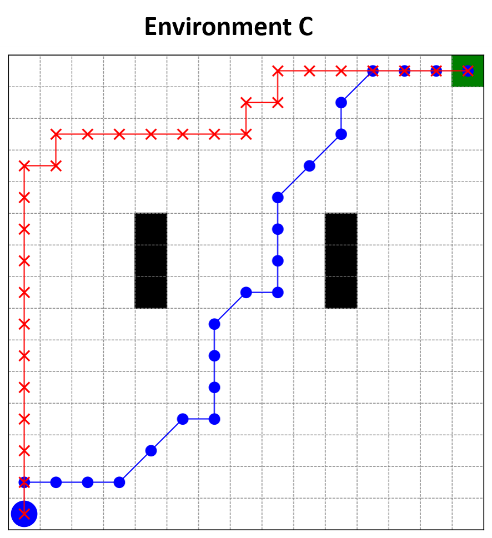 In both environments C and D, where the two models' performance showed success rates of 9/10, the obstacle density has an equivalent effect on their avoidance ability. But the diagonal motion was still more efficient, as with the diagonal model it took (27.4 and 26.8) steps while with the model using only basic motions it required (31.1 and 34.2) steps to reach the goal. This goes to show the contrast: having the capability of moving diagonally shapes up smooth paths, and the agent can maneuver with greater ease.