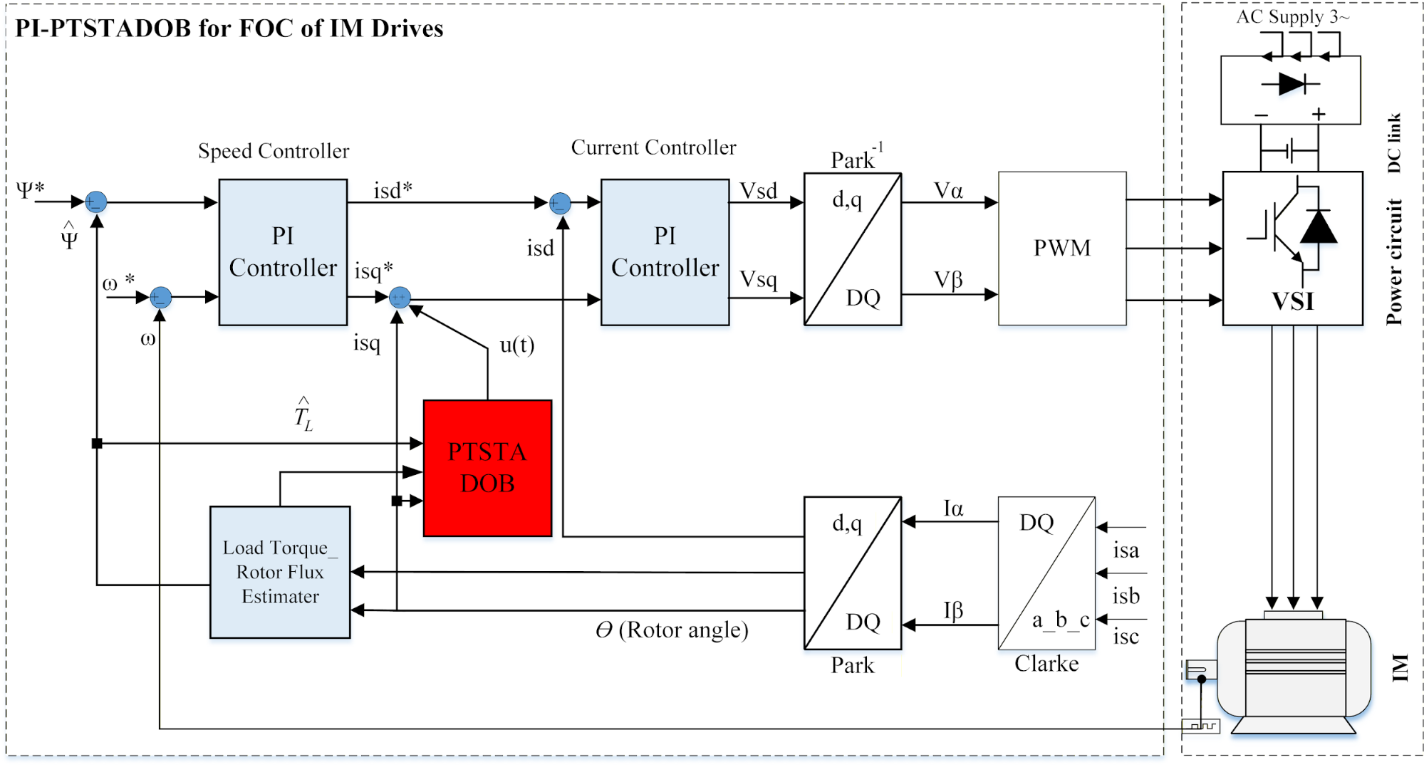 In practical FOC-based IM drive systems, proportional–integral (PI) controllers are predominantly employed in the speed and current control loops due to their simple structure, ease of implementation, and low computational and hardware costs. These advantages make PI controllers particularly attractive for industrial applications where robustness, reliability, and cost-effectiveness are primary concerns [8]–[10]. Consequently, PI-based control architectures continue to dominate commercial IM drive products despite the availability of more advanced nonlinear control techniques.