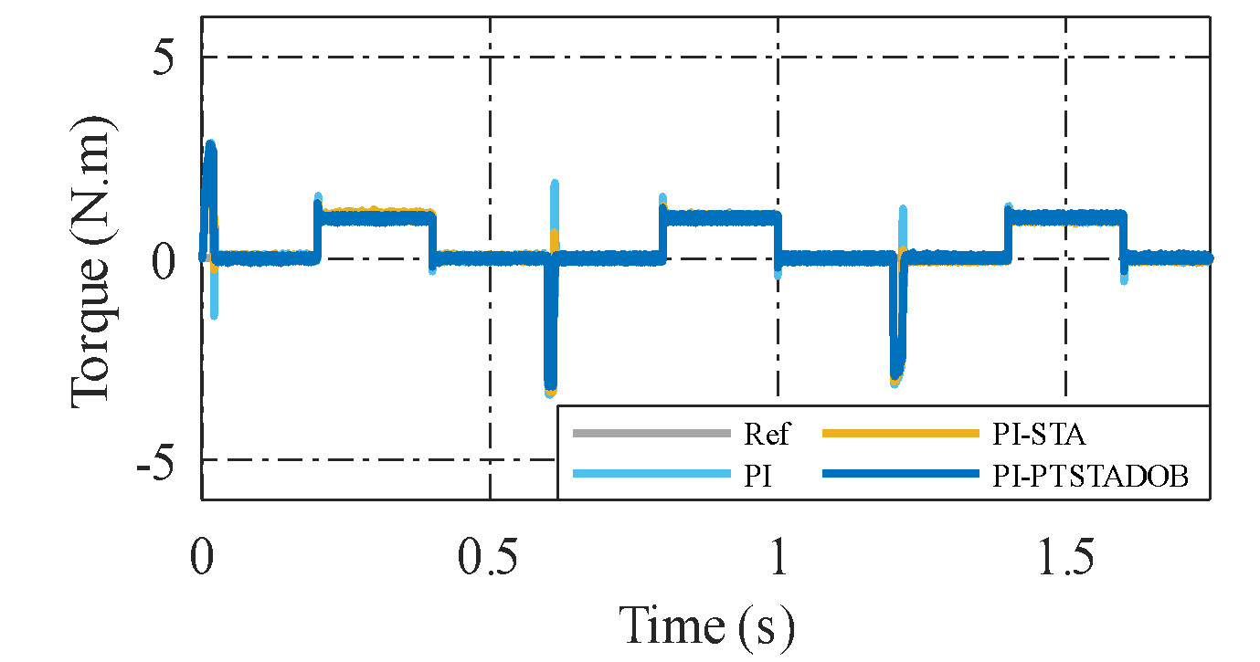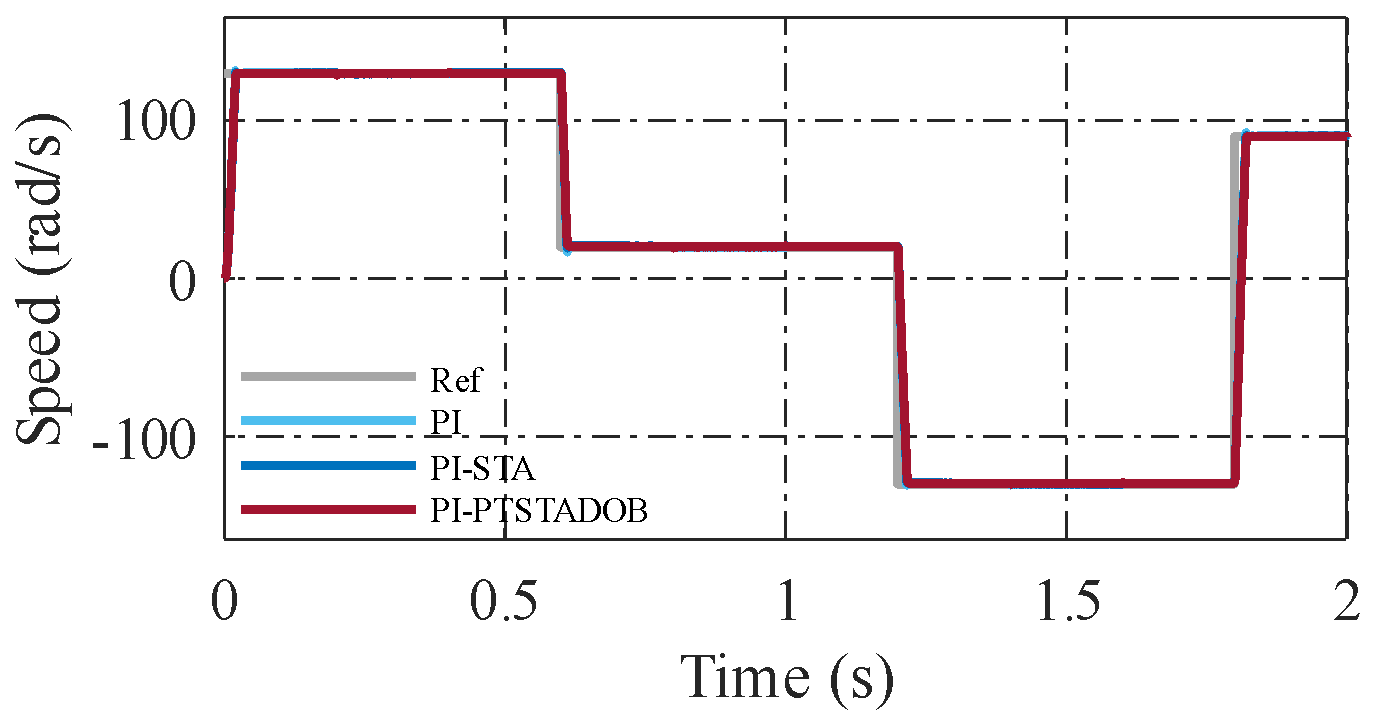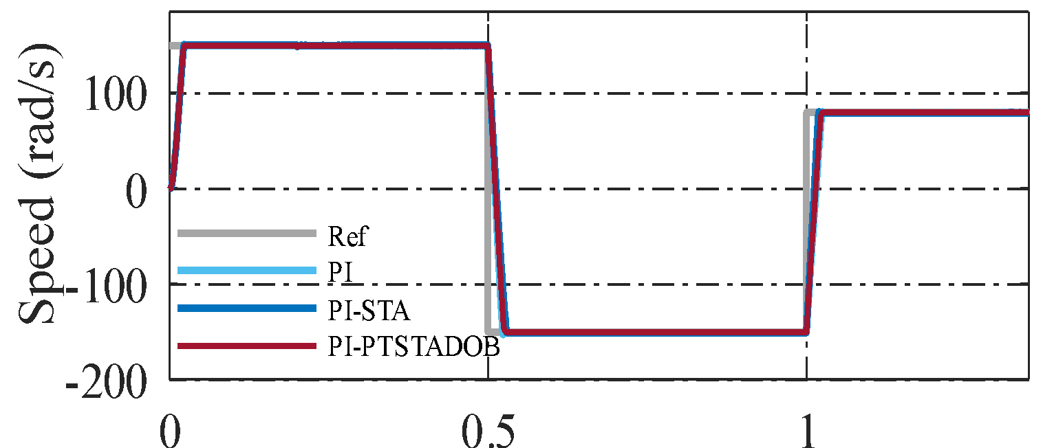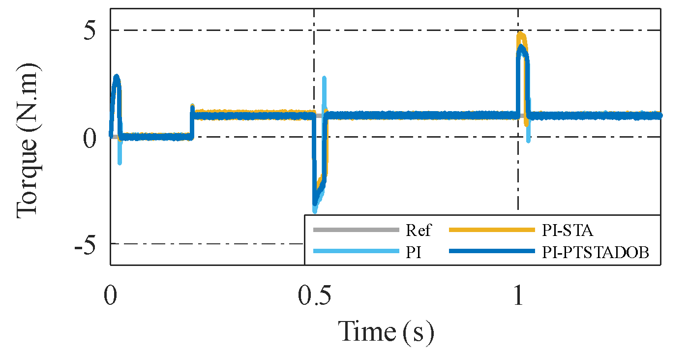 Although the settling times of PI–STA and PI–PTSTADOB are numerically similar, the qualitative transient behavior differs markedly. The proposed controller achieves near-zero overshoot, minimal oscillations, and smoother torque and current responses, as illustrated in Figure 2. This indicates that the improvement is not merely in convergence speed but in overall closed-loop damping, robustness, and control smoothness.