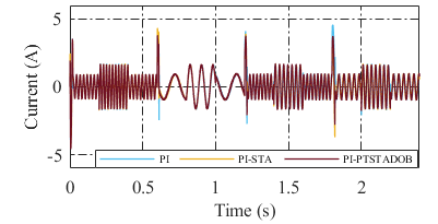 The stator current responses further corroborate the superiority of the proposed approach. The PI controller exhibits pronounced current spikes and increased ripple in the current components, indicating higher electrical stress and reduced noise immunity. The PI–STA controller partially mitigates these effects but still introduces oscillatory current components. In contrast, the PI–PTSTADOB controller maintains smooth and bounded current trajectories with reduced peak amplitudes, demonstrating improved current stress management and enhanced robustness against disturbance-induced fluctuations.