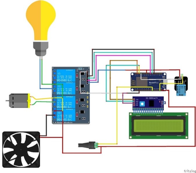 Excessive temperature and humidity in the chicken coop can be reduced with the help of DC fans and mist makers. When the temperature of the chicken coop is too cold, the temperature will be raised with the help of a 25 Watt incandescent lamp.