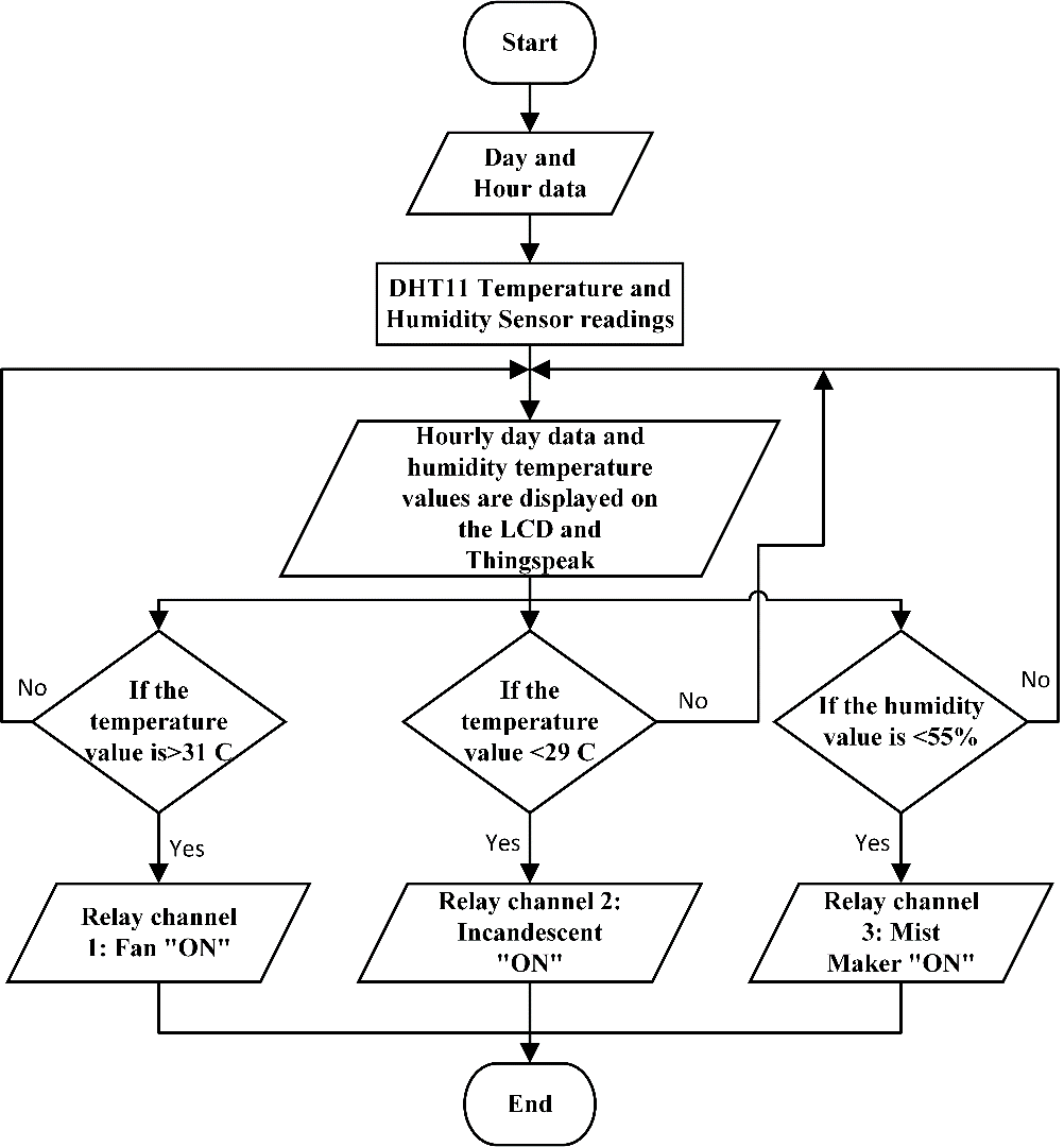 After connecting to the internet network, the DHT11 sensor will automatically detect the temperature and humidity values of the chicken coop environment. Apart from that, there is a program that uses NTP (Network Time Protocol) to detect the time and date of that day, both of which will then be processed by NodeMCU. The data that has been processed by NodeMCU will be sent to the Thingspeak media platform. There is also a relay that will be used to turn on the fan if the detected temperature value exceeds the existing limit. Then turn on the incandescent lamp if the detected temperature value is less than a predetermined limit. As well as turning on the mist maker if the detected humidity value of the chicken coop is less than a predetermined limit.