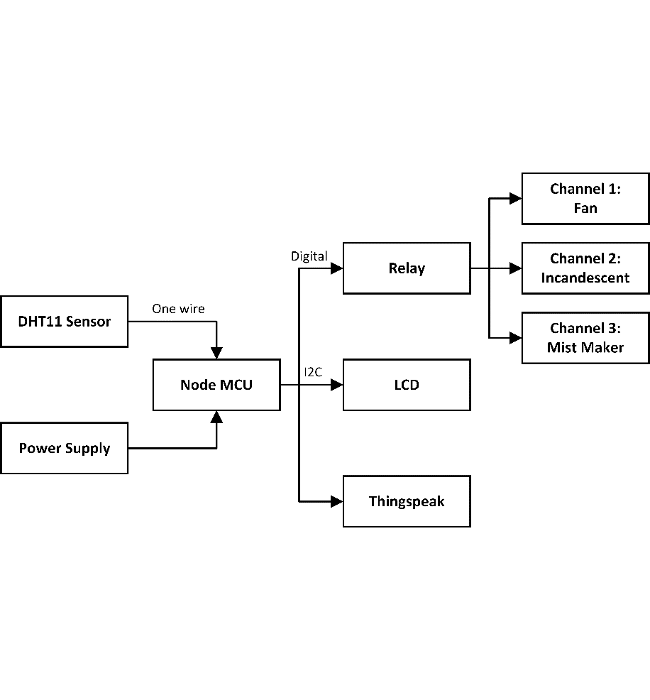 The system design used in this study uses a microcontroller in the form of NodeMCU. NodeMcu is an open source Internet of Things (IoT) platform. NodeMCU includes hardware and firmware for the ESP8226-12 system on a system chip (SoC) of an expressive system that uses the LUA instruction set programming language [21][22][23][24]. Data on temperature and humidity values originating from the DHT11 sensor will be read by NodeMCU and later this data will determine whether or not the existing relay is on [25][26][27]. All temperature and humidity data from the DHT11 sensor will also be sent to the media platform in the form of Thingspeak using the IoT method [28][29][30].