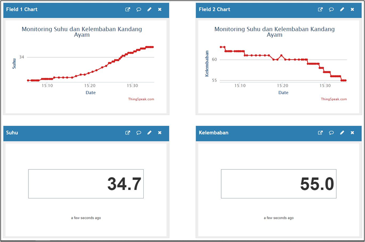 In previous studies, an IoT testing method was carried out on systems built using NodeMCU and using Blynk software to control the temperature and humidity of chicken coops [19]. In addition, there is research using the ATMega 8535 microcontroller and the LM35 temperature sensor [20]. Because the IoT system has been successful in previous research, this research will recommend IoT to control the temperature and humidity values of the chicken coop environment using the DHT11 sensor and then it will be sent to the Thingspeak platform in real-time.
