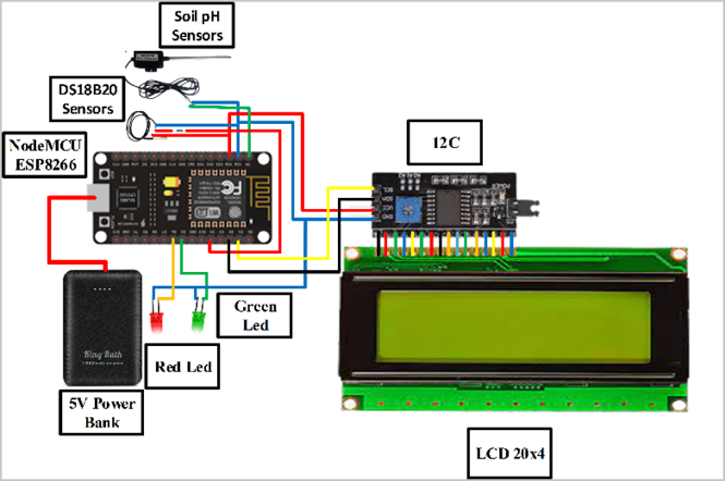 Figure 2 represents a wiring diagram of the entire system designed to connect all components so that they can read soil fertility. Each component has its own task as input, namely the DS18B20 sensor and soil pH sensor and output in the form of a 20x4 LCD display. Othersupporting components such as NodeMCU ESP8266, LED, 12C, and powerbank. Inputs and outputs on NodeMCU can be seen in Table 1.