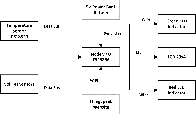 The hardware design in this study includes inputs, controllers and outputs. The input section consists of a DS18B20 sensor which is used to measure temperature or temperature and a soil pH sensor is used to measure alkaline soil levels. The controller uses the NodeMCU ESP8266 which functions as a data processing center for the DS18B20 sensor and soil pH sensor. Each sensor takes the measurement value and the result of the measurement will go to the ESP8266 NodeMCU which will later be processed into data. The output section consists of the ThingSpeak website and a 20x4 LCD that serves to display the results of the temperature sensor readings and soil pH. The system block diagram is shown in Figure 1.