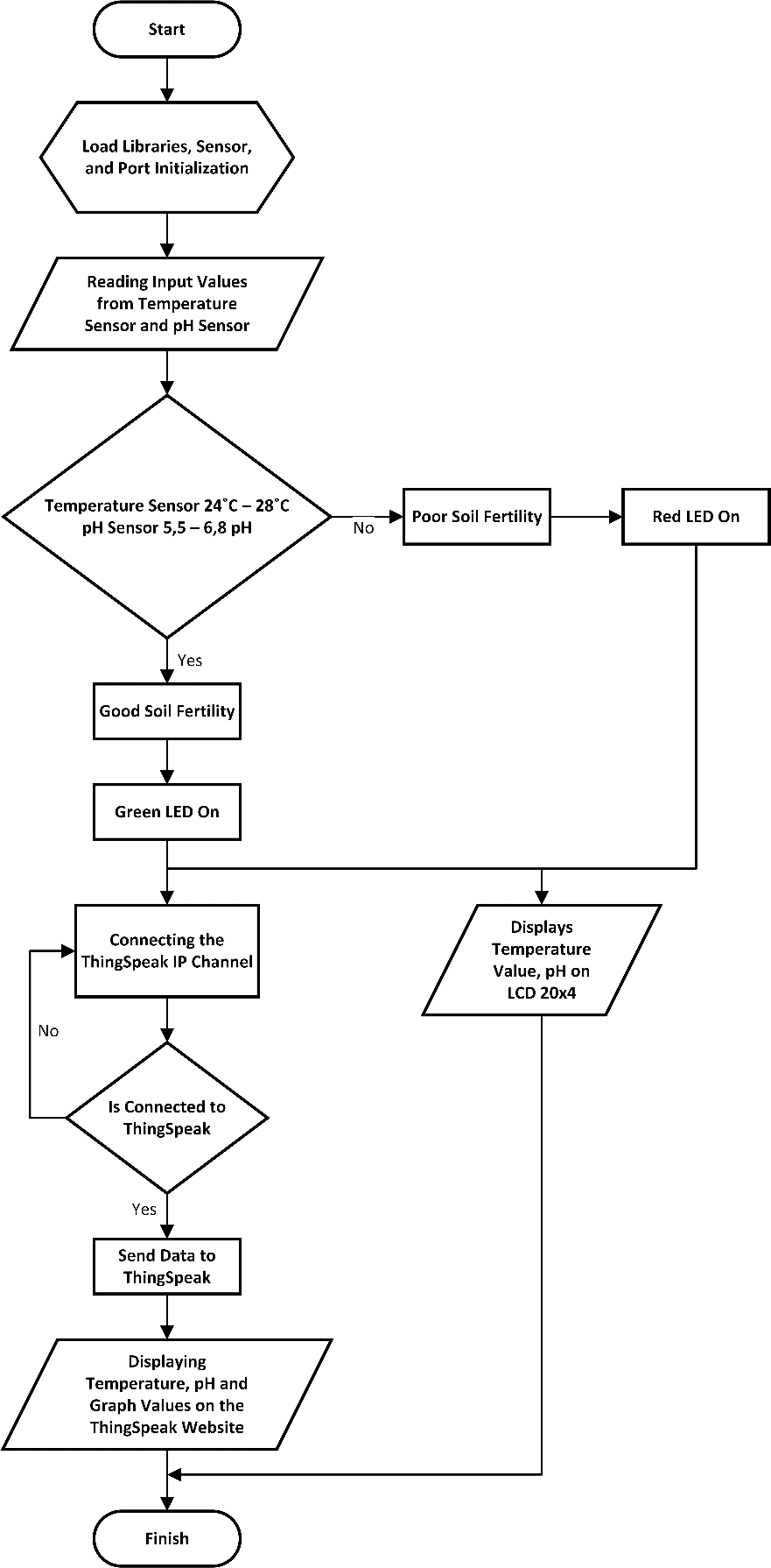 Explanation Figure 1 is that the sensor reads the temperature and acidity conditions of the soil in chili plants in the form of analog values, then the analog values are converted into digital values using ADC (analog to digital converter) on the NodeMCU ESP8266 microcontroller. Furthermore, the digital data will be sent via the Wi-Fi module using the internet network to the ThingSpeak website. In addition, digital data will also be sent on a 20x4 LCD.