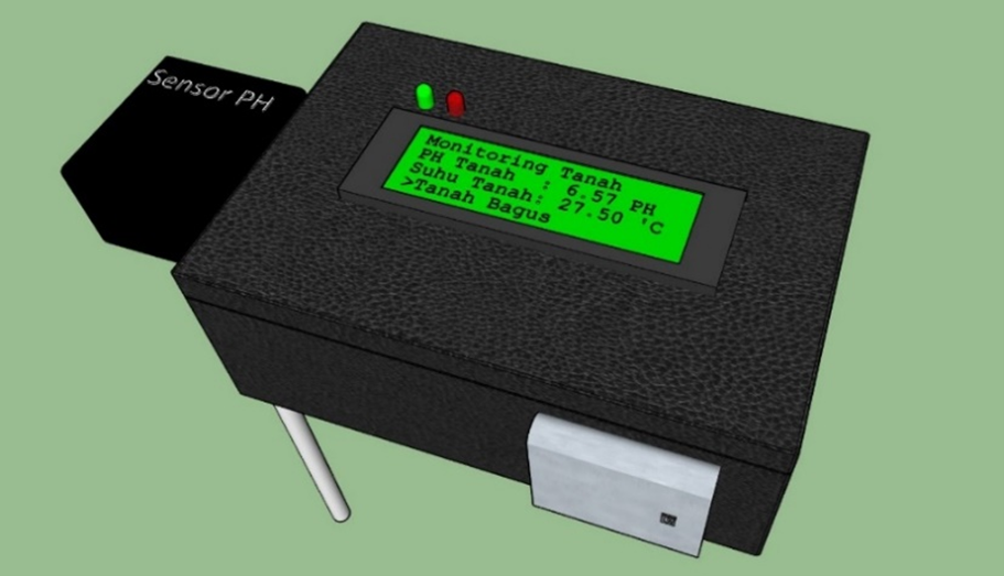 The design of the tool consists of a DS18B20 temperature sensor, ground pH sensor, green led, red led, powerbank and 20x4 LCD. On the inside of the box there are NodeMCU ESP8266, I2C, cables and resistors. The shape of the box has a length of 18 cm, a width of 12 cm, and a height of 6 cm.