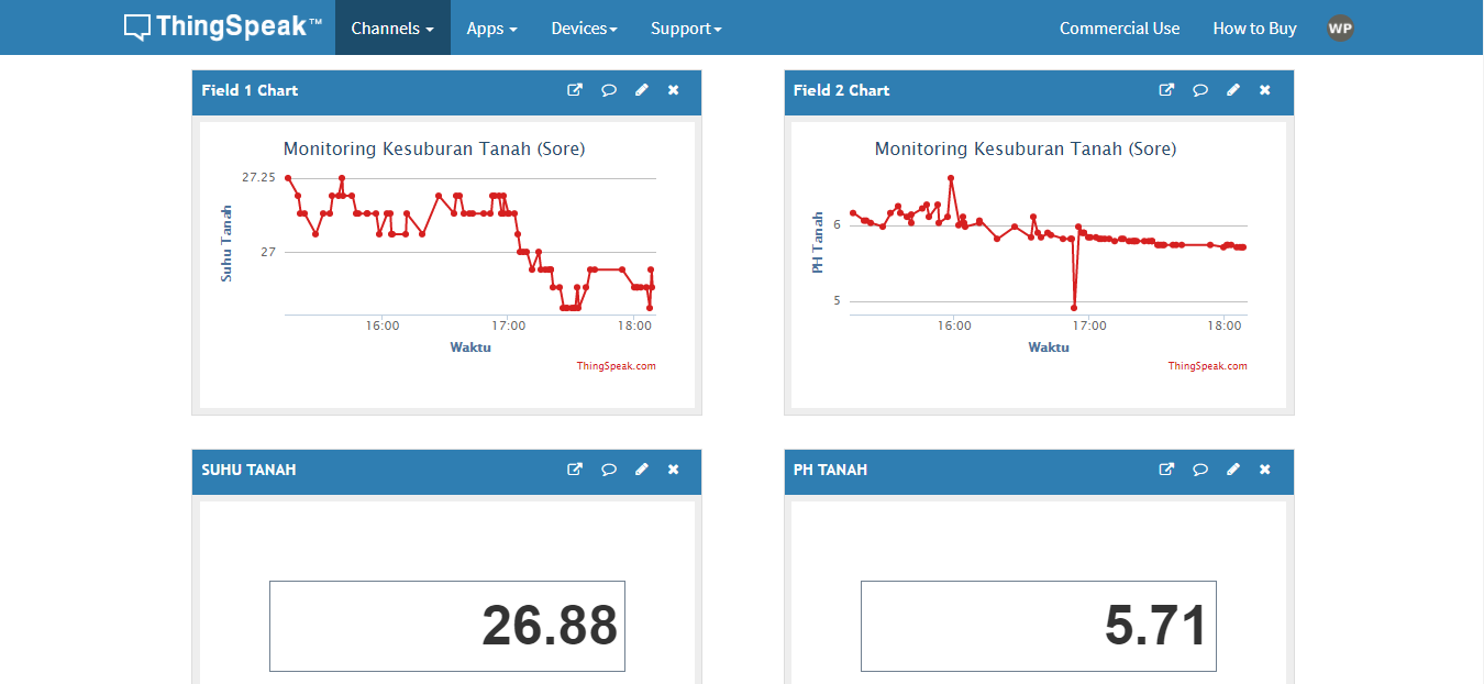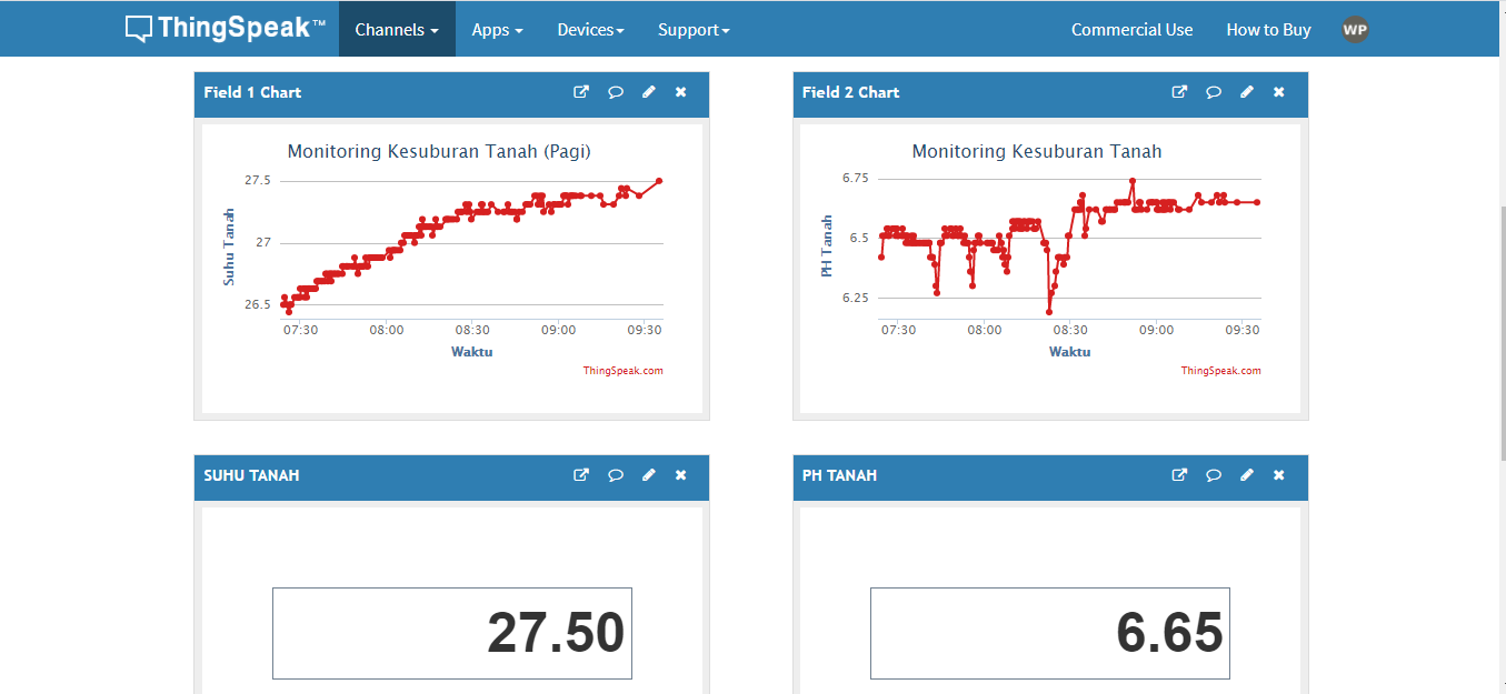 This test aims to ensure that the reading results from the DS18B20 temperature sensor and soil pH sensor can be properly displayed and accessed through the ThingSpeak website. The ThingSpeak website display is in the form of data in the form of graphs, charts and numeric displays of each soil temperature and pH measurement parameters. The system connects with the ESP8266 NodeMCU device until it connects to the ThingSpeak API application obtained from the channel settings. The system will access the SSID and password data connected to the internet network before processing the data. Display the results on the ThingSpeak website as in Figure 7 and Figure 8.