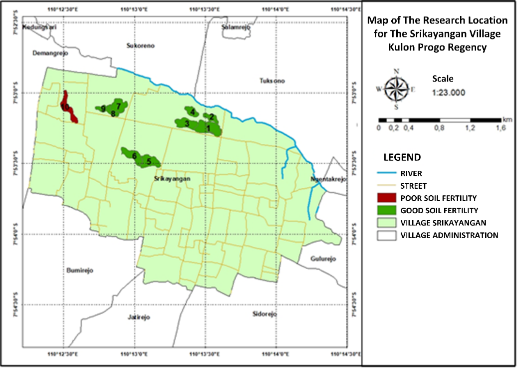 Soil fertility mapping is made based on the results of soil temperature and pH measurements on chili fields in Srikayangan Village by grouping into two classes. Each class is then scored to identify soil fertility which can be seen in Table 6. From the results of soil fertility measurements that have been carried out, there are good soil fertility and bad soil fertility. Therefore, the score for soil fertility in Srikayangan Village is illustrated in Table 7. The results of mapping the fertility of paddy fields with dark red color (score = 1) are described as an ugly fertility rate with a percentage of 10%. While the dark green color (score = 2) is described as a good fertility rate with a percentage of 90% of the number of samples measured. Peta soil fertility in Srikayangan Village can be seen in Figure 9.