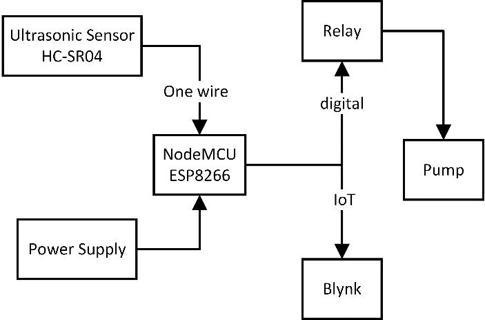IoT is known as the everyday computing of objects that are connected by the internet and capable of identifying themselves to other devices. The characteristic of IoT is that it has the ability to transfer data over a network without human-to-human or human-to-electronic device interaction. IoT works by using programming where each command generates interconnected interactions without human intervention so that humans only serve as supervisors and regulators of the tools that have been designed [14]. In the design of this tool, it uses the HC-SR04 ultrasonic sensor as a height monitoring tool and a 12V DC pump as a water filling tool. This circuit works using predefined programming via the Arduino IDE. Furthermore, for media clouds on IoT, use the Blynk application to monitor water levels [15][16].