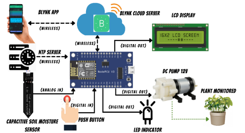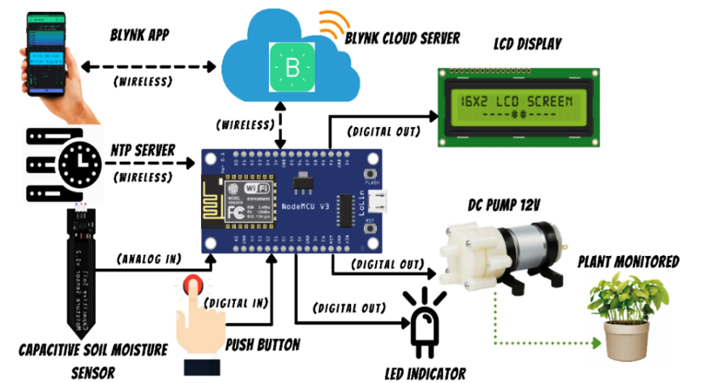 The system is divided into three parts, namely input, process, and output. In the input section, there are four hardware components and virtually/software. In the process section there is only one, namely the N odeMCU ESP 8266 microcontroller. In the output section, it consists of four hardware and software components. NTP Server is a software input component that is entered through a program with the NTPClient.h library and with the functions contained in it. NTP Server is used as a real time input on systems that takes real time. A capacitive soil moisture sensor is an input part that is used to measure soil moisture in this system. The push button is used as a manual control for manually watering plants. The blynk application is an application platform used as a real time monitoring and controller that can be done via a smartphone with an internet connection. LCD (Liquid Crystal Display) is used to display the necessary data such as moisture value, ADC value, soil condition, and pump condition. The pump is used as a system output that plays a role in draining water from the reservoir to plant objects. LED indicator as a system indicator to find out yang being performed by the system.