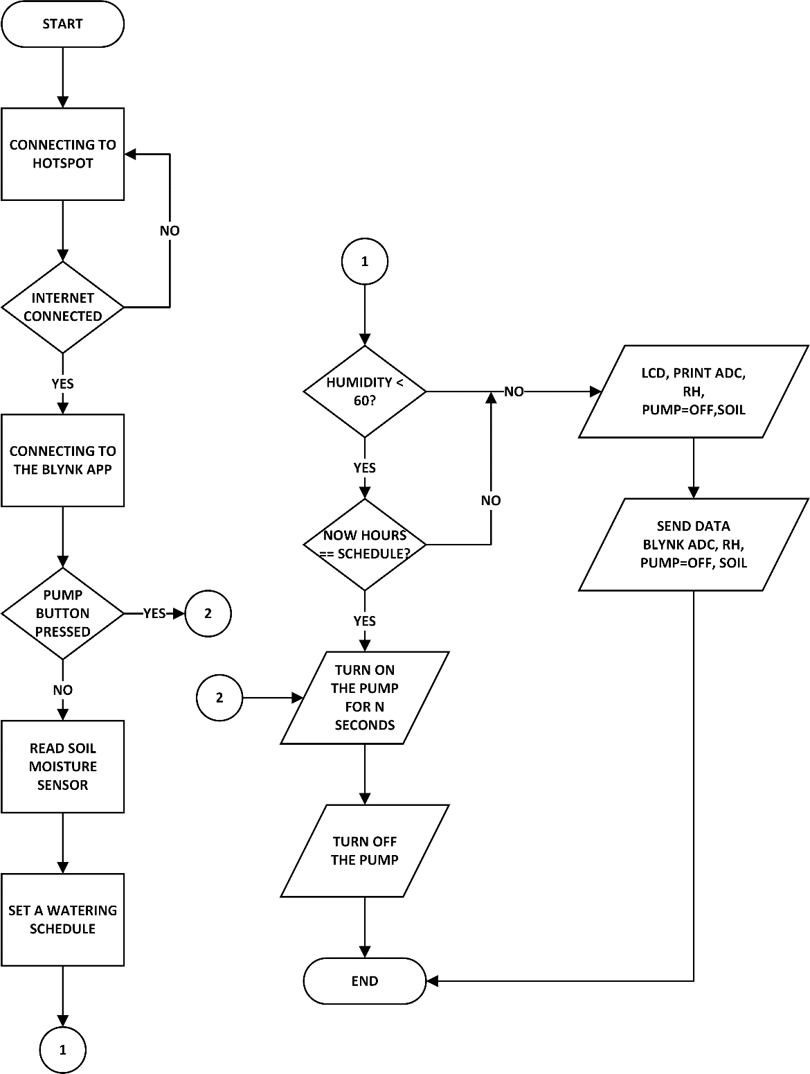 Microcontroller programming is essential for executing the necessary commands on the microcontroller circuit. In this study, MCU programming used Arduino IDE software and C language. Flowcharts are used as a reference for writing programs that work according to commands. The flowchart in this study can be seen as in Figure 3. When the hardware input voltage is supplied, the microcontroller will start the process of initializing the required inputs and outputs and variables. The data entering the microcontroller is processed and executed on the output drive circuit, that is, the relay turns on the DC water pump to make the plants spray water.