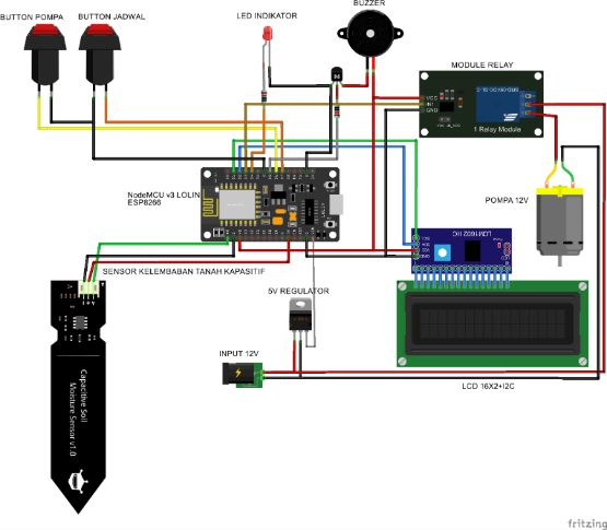The cabling design of the hardware system is a series of several components, namely the soil moisture capacitive sensor, water pump, LCD display, indicators, and the NodeMCU ESP8266 microcontroller with the aim of ensuring that it works properly and optimally so that no trouble occurs.