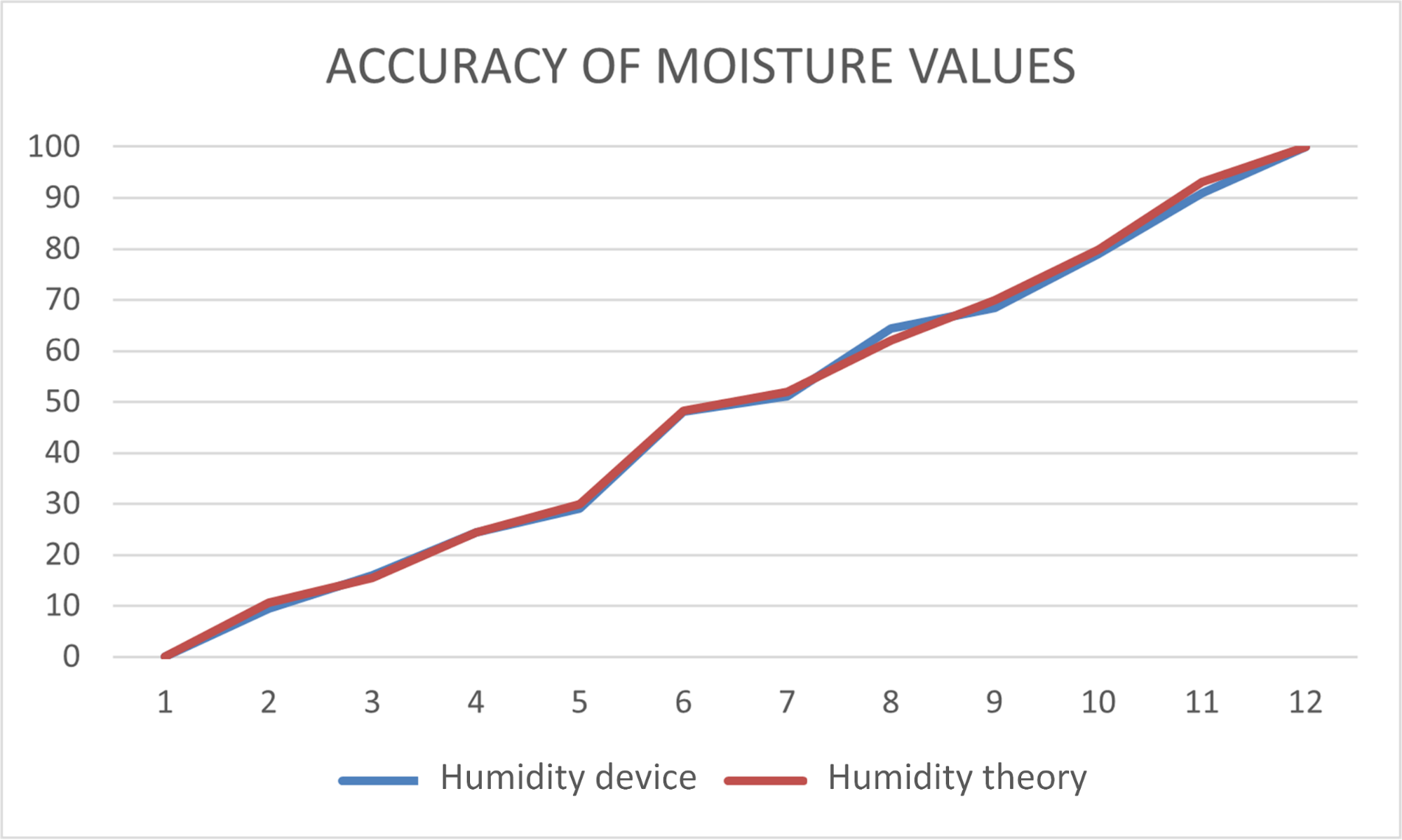 Based on Table 3, the sample data yielded an average error of 0.711% which was compared to the theoretical value. This calibration testing method was also carried out in research [15] using the American Standart Method theory. As seen from the graph in Figure 5, the difference in the graph is relatively small, the difference value looks larger at values above 60% humidity.