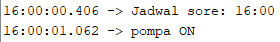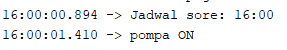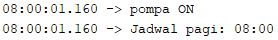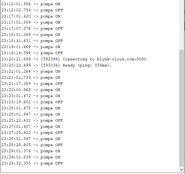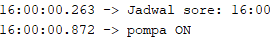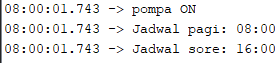 Schedule testing aims to test the accuracy of the system's response to time. The schedule is TRUE if the schedule value/time is equal to the current time. The system response can be observed through the serial monitor software Arduino IDE as in Figure 6. This system does not use Realtime Time Clock (RTC) hardware, but uses NTP client or Network Time Protocol where time is taken from the accompaniment protocol which functions to time synchronization in the form of dates, hours, minutes, and seconds [16][17][18]. From the time reference, the schedule can be adjusted. However, the response of the system is not 100% the same as the time of the NTP, that is, there is a slight difference. The results of the test schedule can be seen in Tabel 4.
