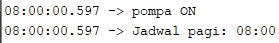 Testing the time set of the pump on aims to find out the accuracy of the pump time on. The time the pump is on will be related to the water discharge that will be released by the pump, so the accuracy of the pump time turns on greatly affects the system. The test is carried out by setting a varied time as in Table 6. After setting the pump time to turn on, the system response is observed by looking at the serial monitor Arduino IDE as in Figure 7.