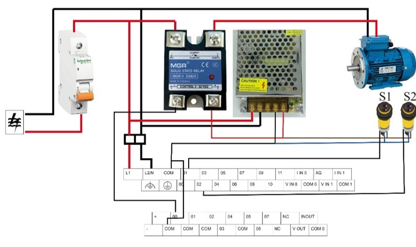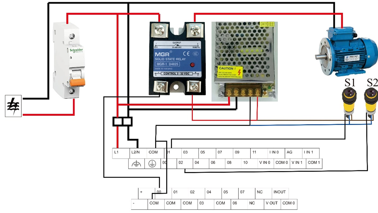 The hardware components, consisting of sensors as input and an induction motor as output, are connected to the PLC, as shown in Figure 3.