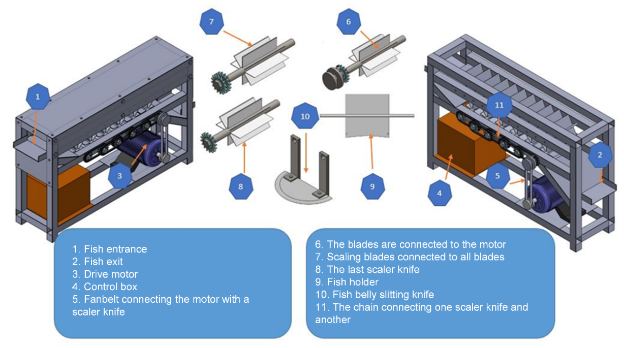 The system design in Figure 1 serves as a reference for creating the tool. The detailed explanation of the tool design is as follows: the fish entry point is indicated at number 1, and sensors will be placed there. Once the fish enters, it will undergo the scaling process. The design of the scaling knives is indicated at numbers 6, 7, and 8. To prevent the fish from being scattered or escaping during the scaling process, a fish holder is provided at number 9. The fish gutting knife is indicated at number 10. After the fish completes the scaling and cleaning process, it will exit through number 2, where another sensor is located. Number 4 represents the storage box for the control components.