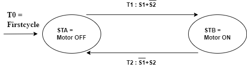 After designing the flowchart, the next step is to design a state diagram. A state diagram is a graph that represents the events or states of a system in the form of circles. These circles are referred to as "states". Each state contains input and output information of the system [19][20]. The result of the state diagram design is shown in Figure 5. There are two conditions used in the state diagram: the OFF state (STA) and the ON state (STB) of the motor. The T0 condition represents the initial state to start the system. T1 represents the active state of sensor 1, where it detects the presence of a fish and switches the motor from OFF to ON. T2 represents the active state of sensor 2, where it detects the presence of a fish and switches the motor from ON to OFF.