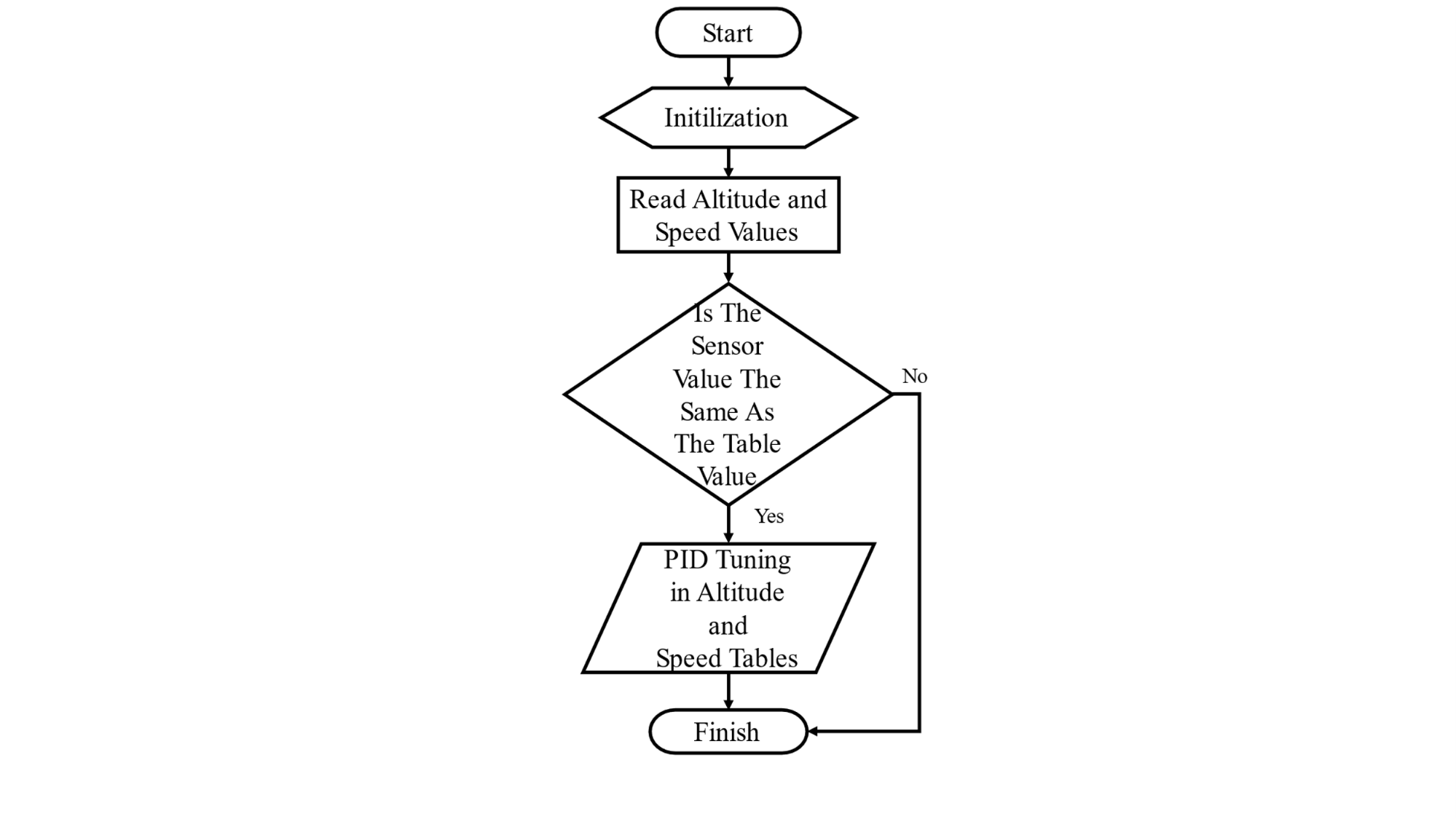 This system flow diagram shows the process of PID tuning by carrying out the prefix initialization of the connected Quadcopter via telemetry which is connected using MAVlink to the flight controller, then accessing data on the Quadcopter, reading the altitude and speed sensor values, after that carrying out the command process to run the program to PID tuning, then the flight controller will send the results of the PID tuning process which will be displayed on the GCS (Ground Control System) computer. The system flow chart is shown in Figure 3.