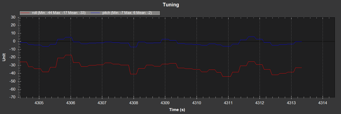 The equation used to find the average PID is equation (4), the equation used to find the average is by the amount of data used divided by the amount of experimental data, the results of the average PID are obtained, with the amount of data being the tuning value PID and lots of data is the number of trials performed shown in Table 9. From the results of testing the PID average value used for a height of 80 meters and a speed of 70 m/s which will later be used to make flights, so that later it can be concluded that the PID for a height of 80 meters and a speed of 70 m/s used provides a more stable effect that where this can be seen from the roll angle which does not exceed ±90°, which if the plane rolls more than 90° can cause Over Roll which can cause an accident during flight causing the vehicle to fall from a height. From the flight process carried out, we get a graph of the roll for the red color which is the degree to roll while the blue one is the target roll which is shown in the Figure 7.