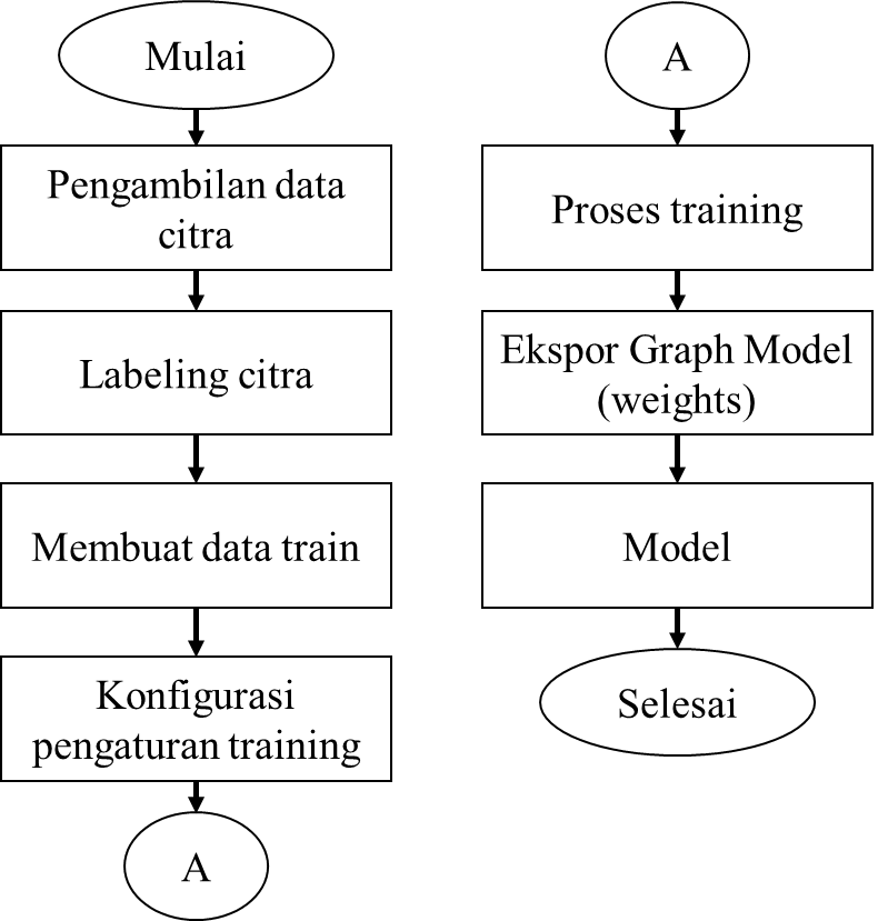 Proses pelatihan gambar dimulai dari pengambilan gambar yang akan dijadikan data citra, kemudian dilakukan pelabelan pada masing-masing gambar yang telah diambil sebelumnya, kemudian nilai pelabelan gambar yang disimpan dalam file .txt tersebut akan dipersiapkan menjadi data train, setelah dilakukan konfigurasi pengaturan training, lalu dilakukan proses training sesuai dengan pengaturan sebelumnya. Setelah selesai akan didapatkan graph model atau dataset pendeteksian baru dengan format file .weights. Setelah itu dilakukan proses modelling dengan program utama dari YOLO. Pada penelitian ini, pembagian dataset yang digunakan adalah 7000 dataset training dan 1000 dataset validation.