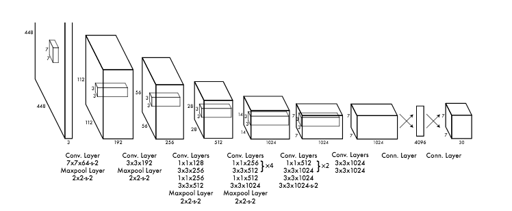 Jaringan deteksi YOLO memiliki 24 lapisan konvolusi (convolutional layer) yang diikuti oleh 2 lapisan yang terhubung penuh (fully connected layer). Beberapa lapisan konvolusi menggunakan lapisan reduksi 11 sebagai alternatif dalam mengurangi kedalaman feature maps yang diikuti oleh 3